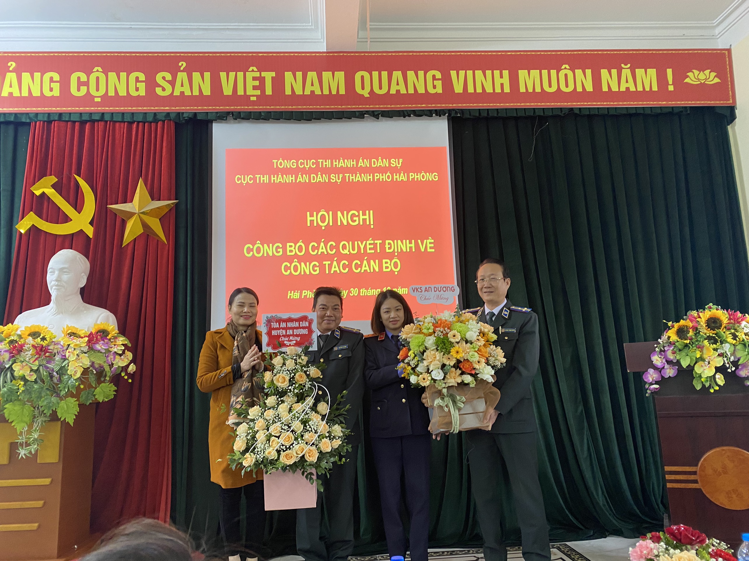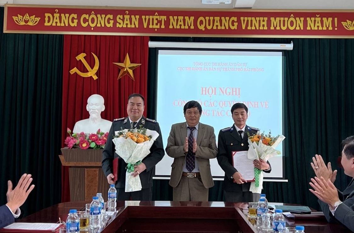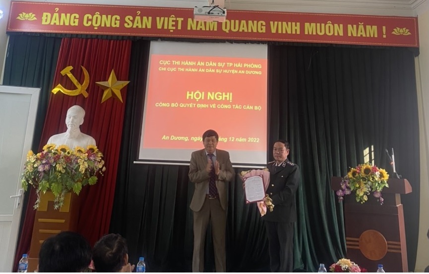 Trước đó, Cục trưởng Cục Thi hành án dân sự thành phố có quyết định điều động, bổ nhiệm và biệt phái các công chức, công chức lãnh đạo theo thẩm quyền, hiệu lực từ ngày 19/12/2022 (Điều động, bổ nhiệm đồng chí Tô Anh Dũng, Phó Chi cục trưởng Chi cục THADS quận Dương Kinh giữ chức vụ Phó Chi cục trưởng Chi cục THADS huyện An Dương; Điều động, bổ nhiệm đồng chí Lê Văn Thụy, Phó Chi cục trưởng Chi cục THADS quận Hồng Bàng giữ chức vụ Phó Chi cục trưởng Chi cục THADS quận Dương Kinh; Bổ nhiệm đồng chí Vũ Thế Khương, Chấp hành viên sơ cấp Chi cục THADS quận Hồng Bàng giữ chức vụ Phó Chi cục trưởng Chi cục THADS quận Hồng Bàng; Biệt phái đồng chí Trần Mạnh Cường, Phó Chi cục trưởng Chi cục THADS huyện Tiên Lãng nhận nhiệm vụ tổ chức thi hành án tại Chi cục THADS huyện Thủy Nguyên; Điều động đồng chí Nguyễn Sơn Lâm, Chấp hành viên sơ cấp Chi cục THADS huyện Thủy Nguyên nhận nhiệm vụ công tác tại Phòng Nghiệp vụ và tổ chức thi hành án Cục THADS thành phố ).