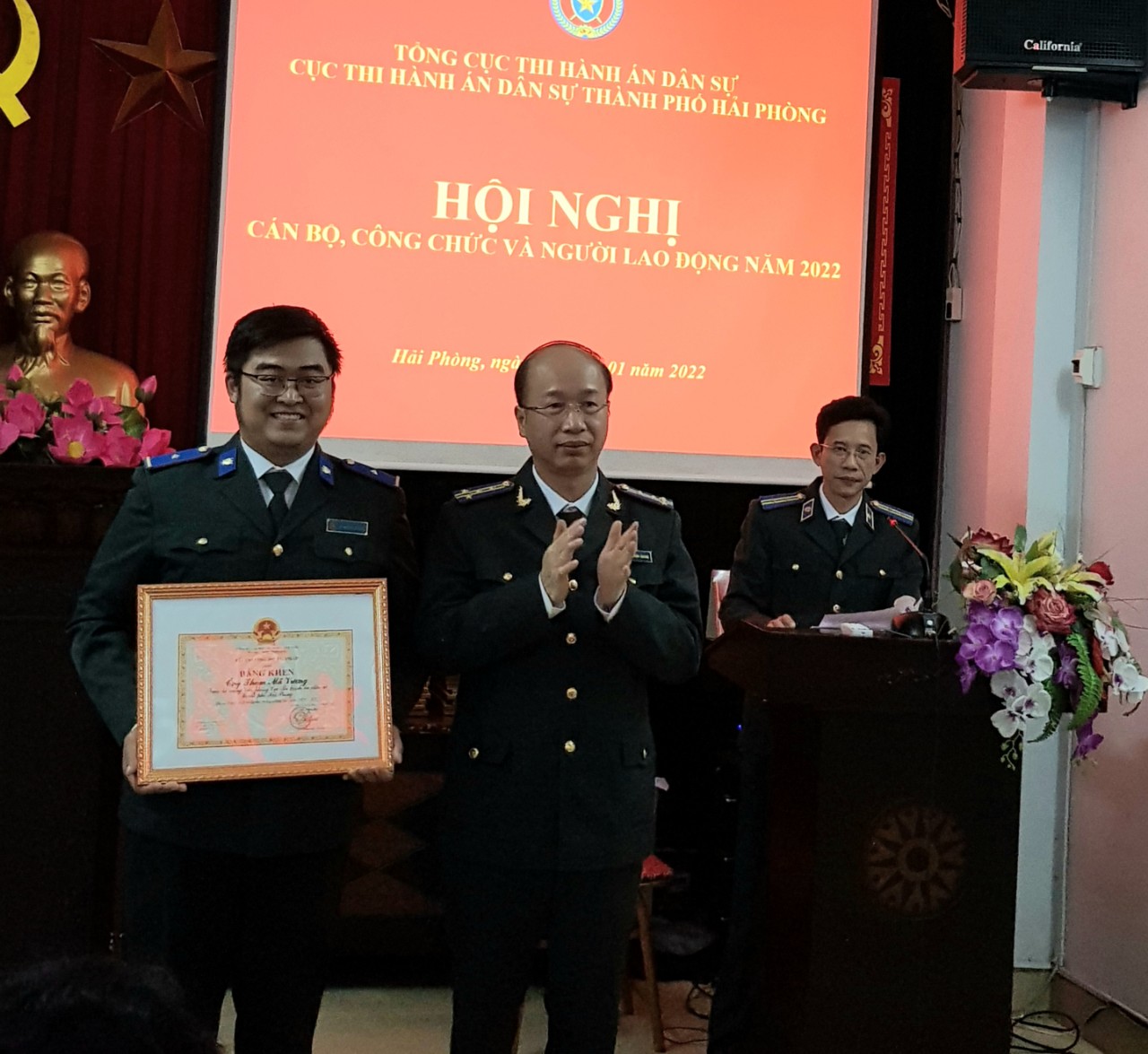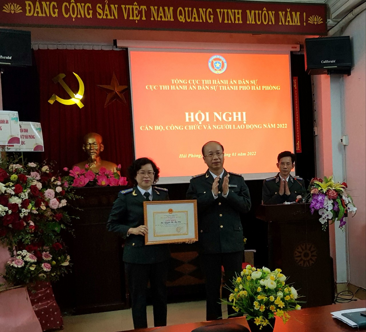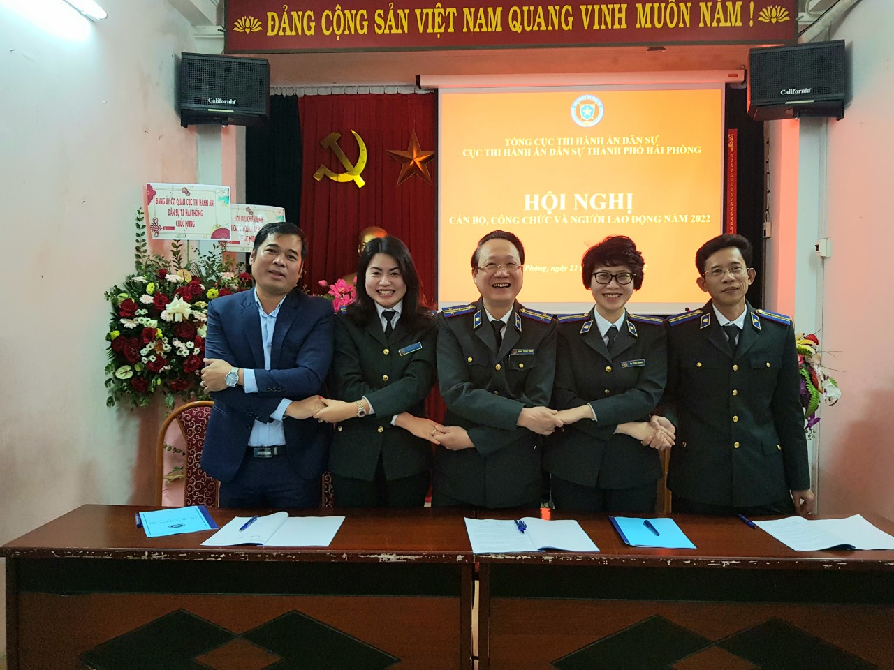 Ngày 21/01/2022, Cục Thi hành án dân sự thành phố Hải Phòng phối hợp với Công đoàn cơ quan tổ chức Hội nghị cán bộ, công chức và người lao động năm 2022 theo đúng tinh thần và nội dung của Hướng dẫn số 08/HD-CĐVC ngày 25/11/2021 của Công đoàn Viên chức thành phố Hải Phòng. Hội nghị đã nhận được sự quan tâm, ủng hộ của toàn thể Đảng ủy, công chức, người lao động cơ quan Cục THADS thành phố dưới sự chủ trì của Đoàn chủ tịch gồm 02 đồng chí Cục trưởng và Chủ tịch Công đoàn cơ quan.