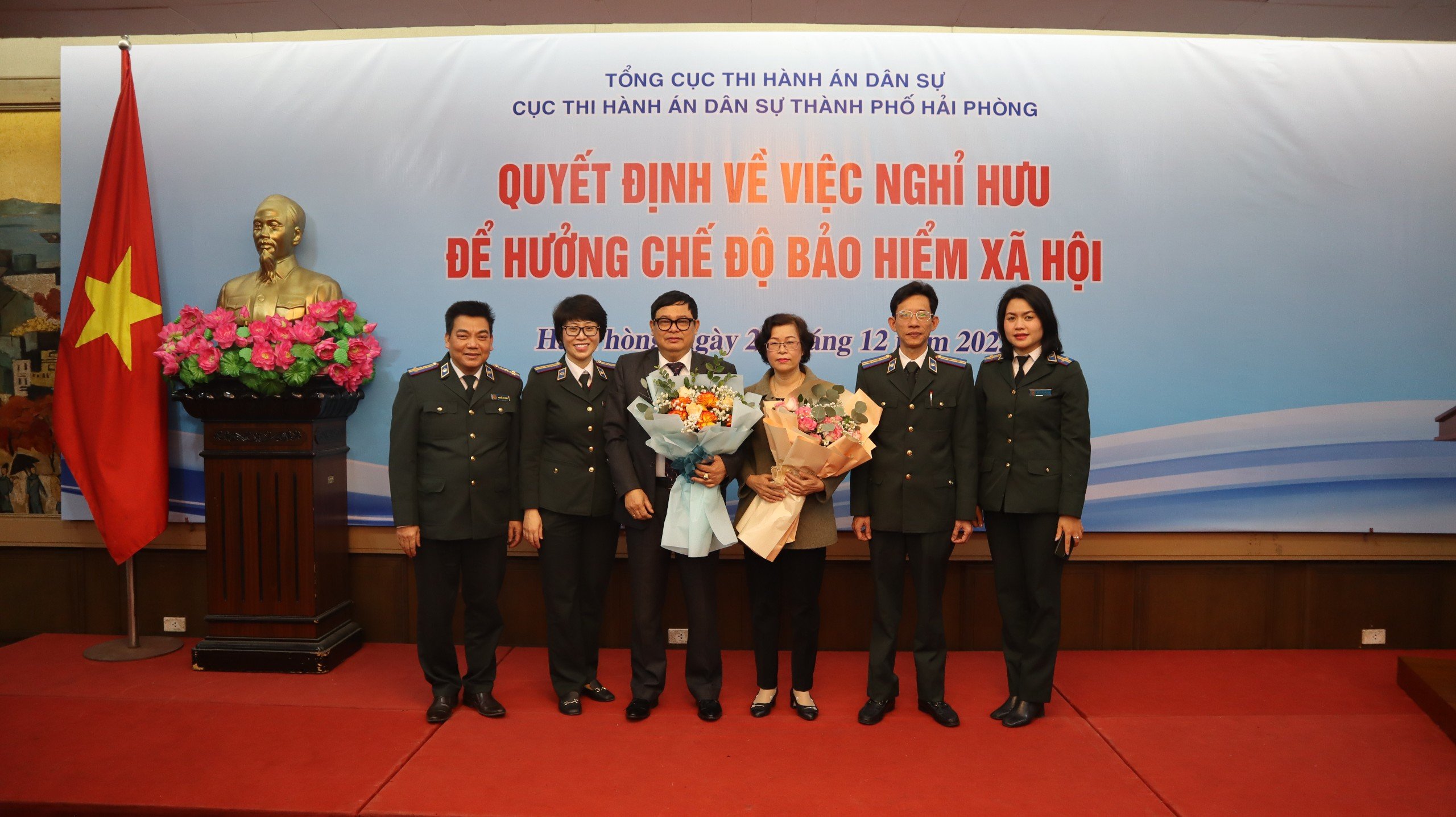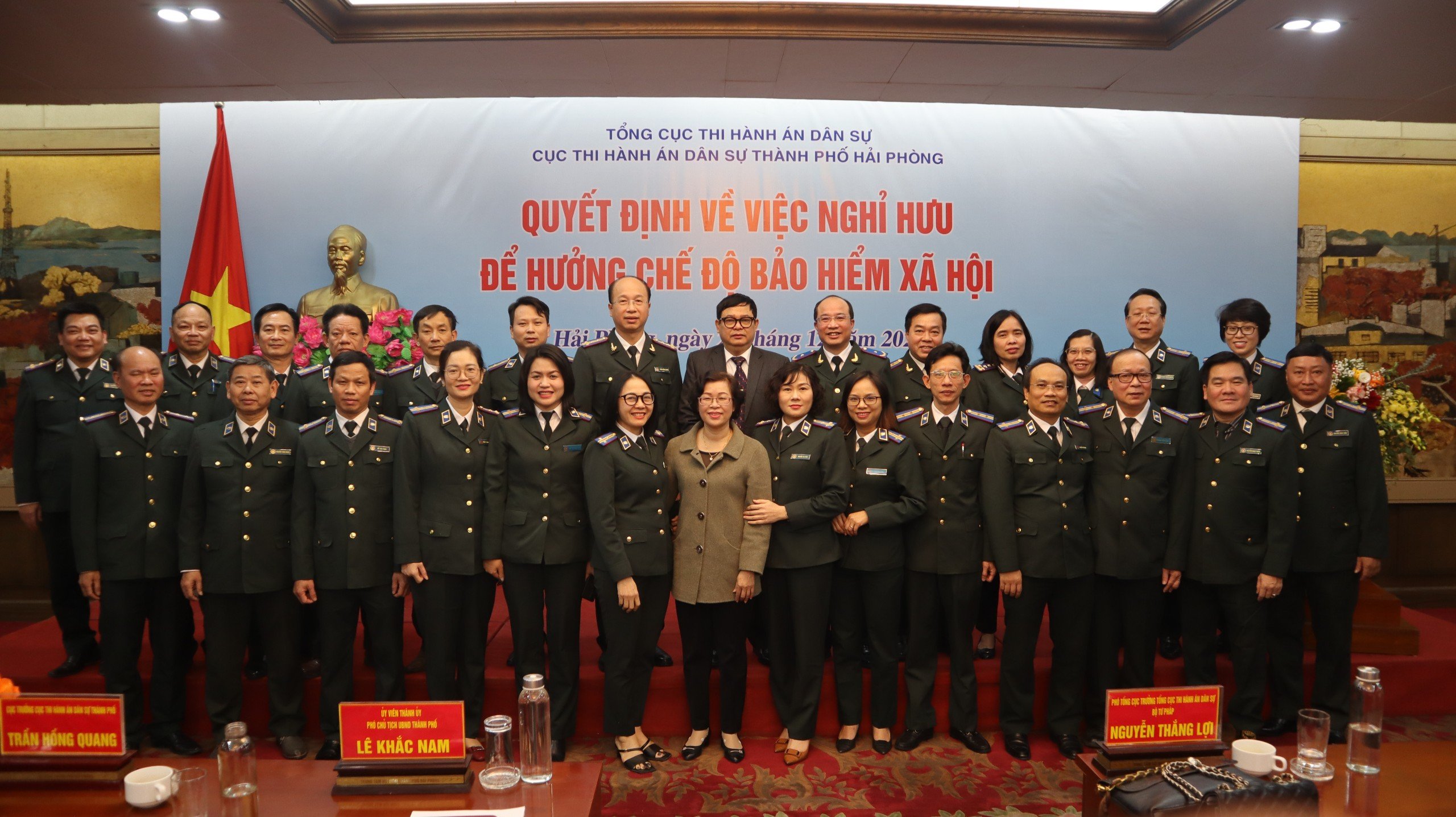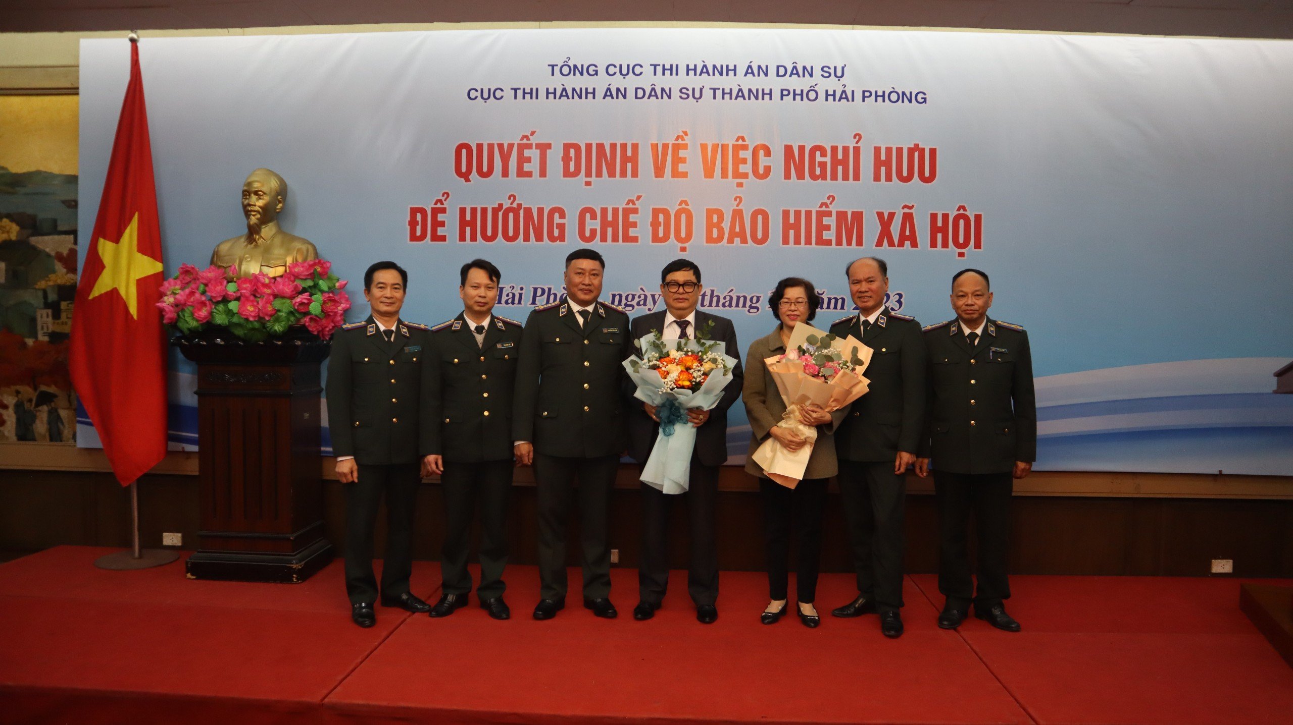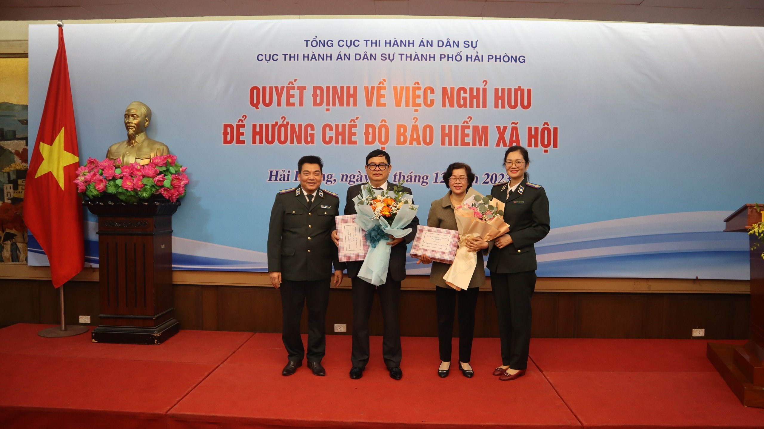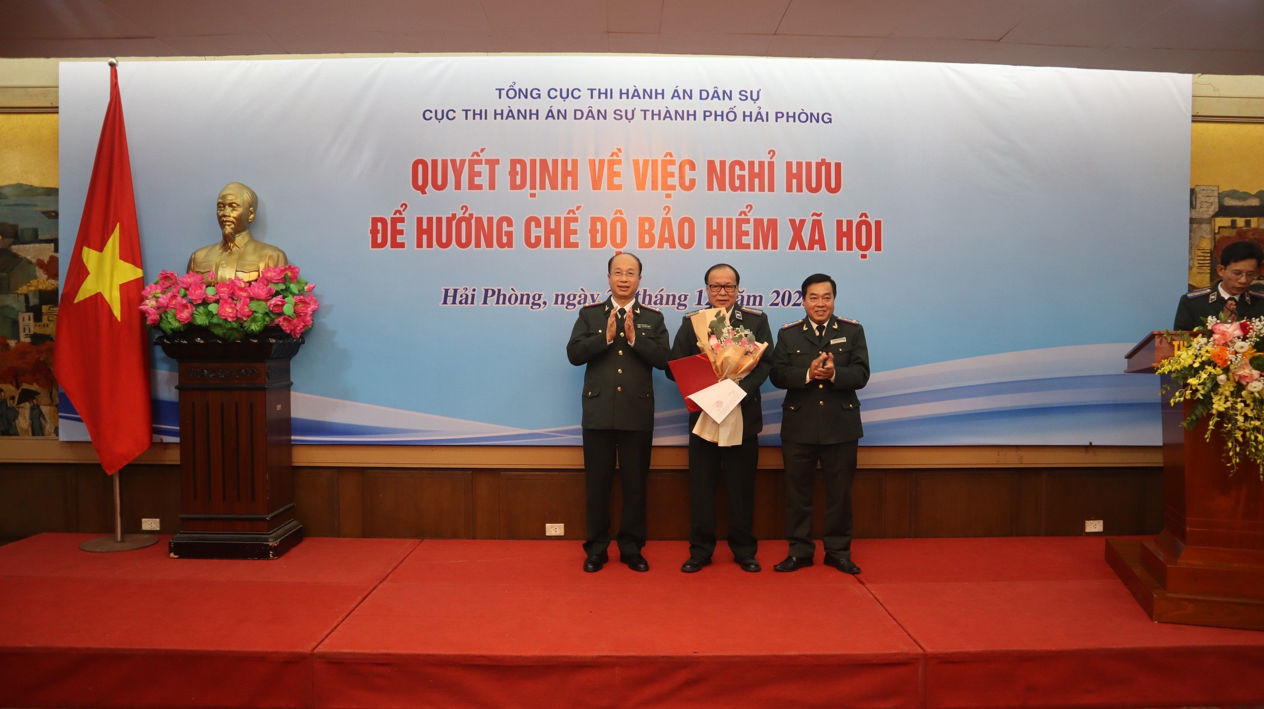 Phát biểu tại Hội nghị, đồng chí Nguyễn Thắng Lợi, Phó Tổng Cục trưởng chúc mừng 02 đồng chí Phó Cục trưởng và đồng chí Phó trưởng phòng chuyên môn Cục Thi hành án dân sự thành phố Hải Phòng đã hoàn thành xuất sắc nhiệm vụ được giao và nhận được Quyết định nghỉ hưu để hưởng chế độ BHXH.