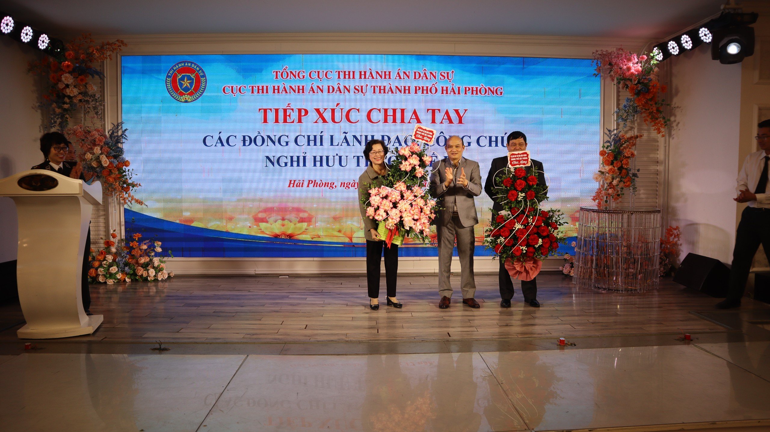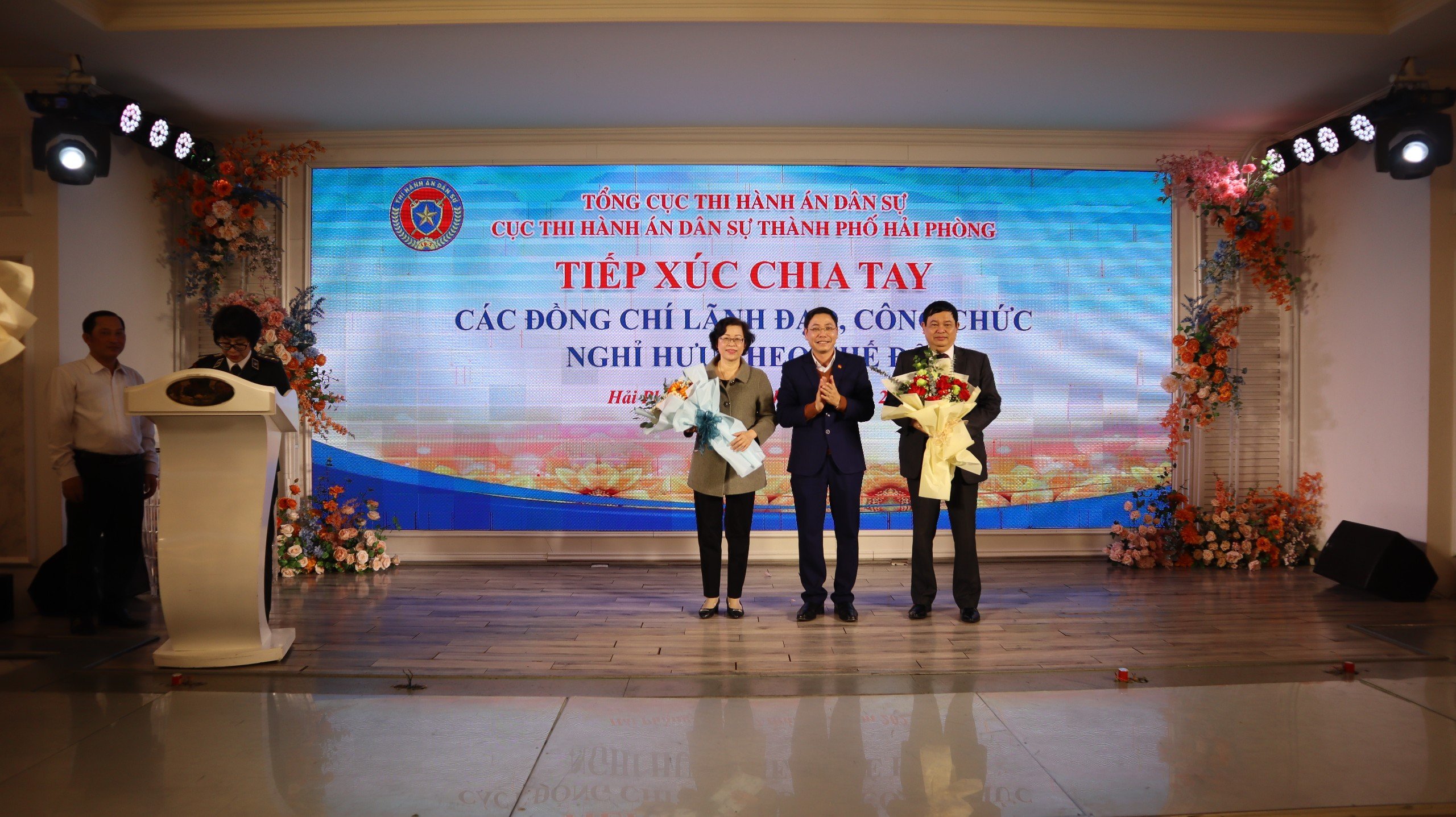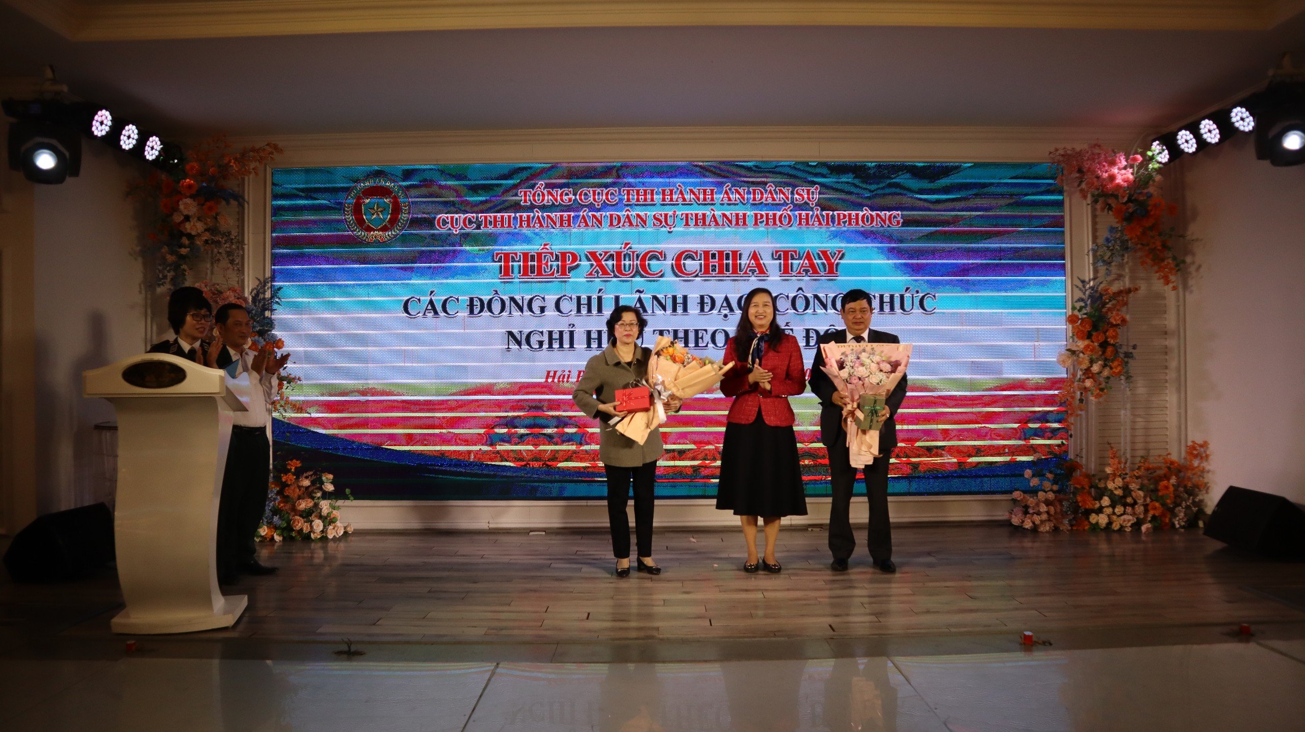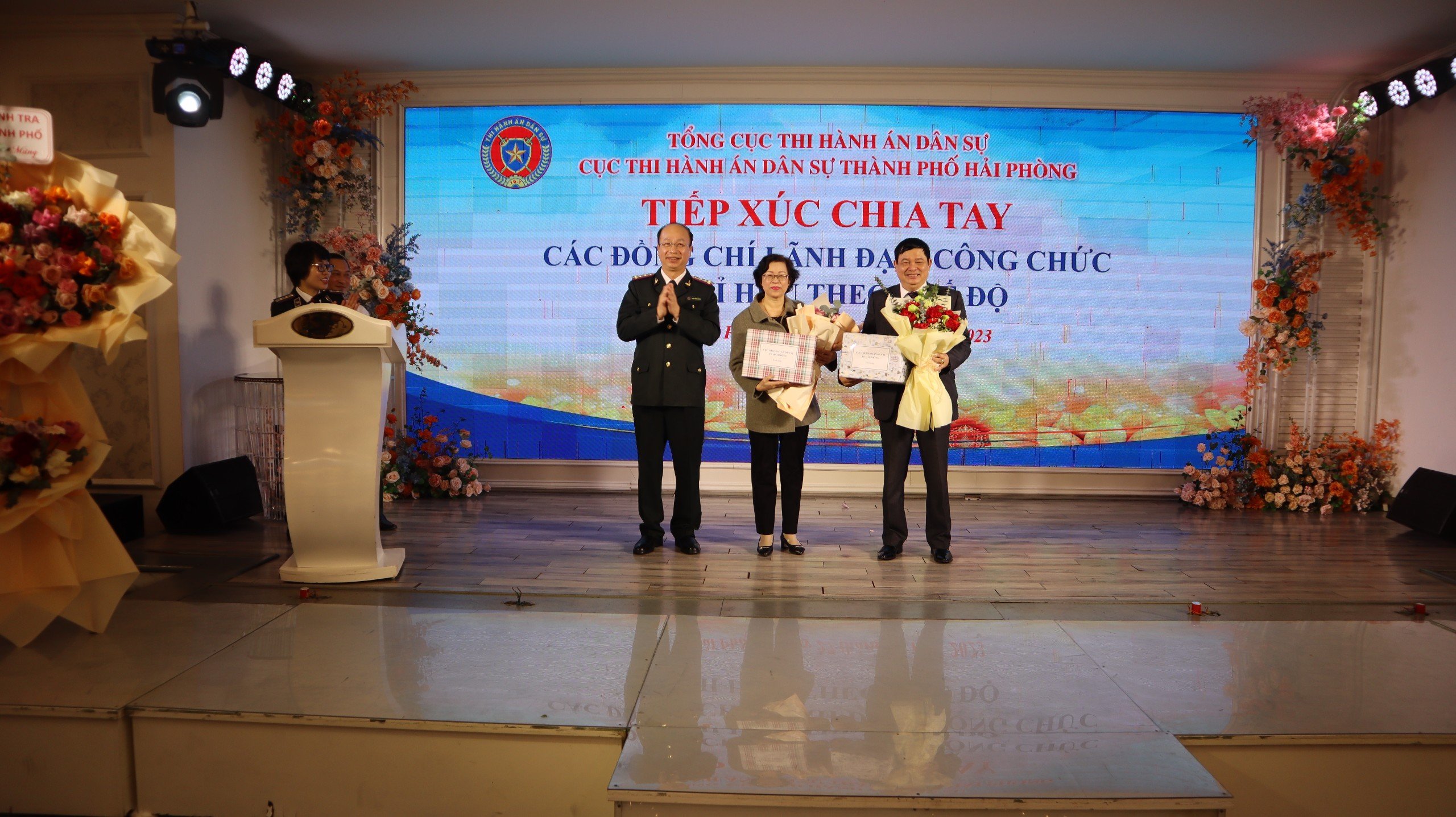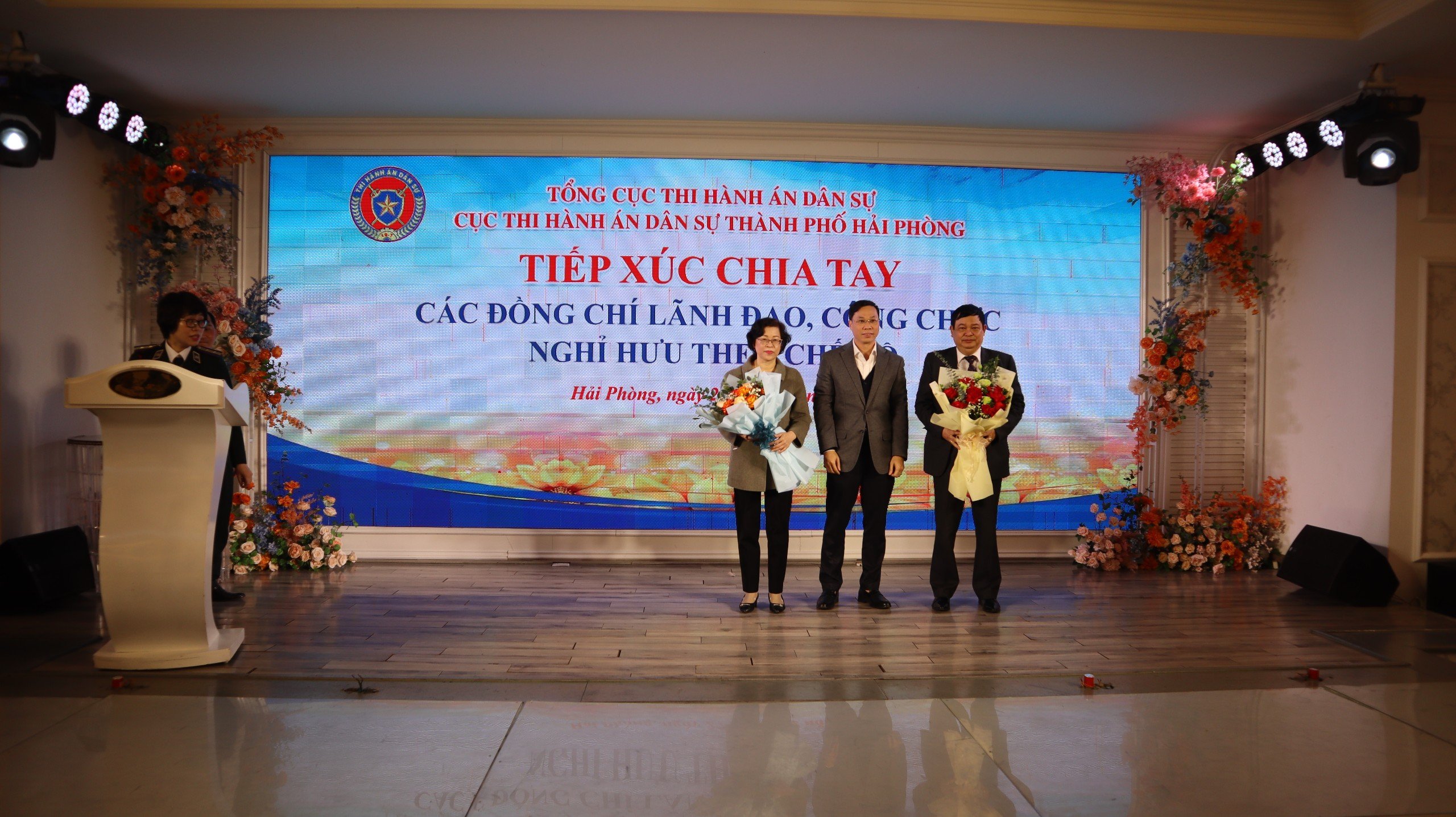 Phát biểu tại Hội nghị, đồng chí Nguyễn Thắng Lợi, Phó Tổng Cục trưởng chúc mừng 02 đồng chí Phó Cục trưởng và đồng chí Phó trưởng phòng chuyên môn Cục Thi hành án dân sự thành phố Hải Phòng đã hoàn thành xuất sắc nhiệm vụ được giao và nhận được Quyết định nghỉ hưu để hưởng chế độ BHXH.