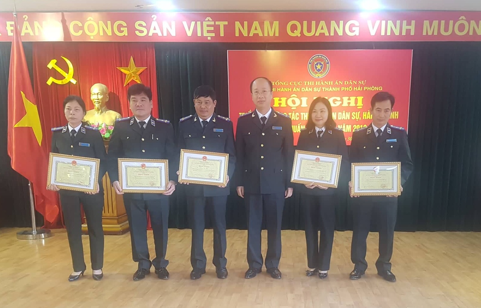 Tại Hội nghị, Cục Thi hành án dân sự thành phố đã báo cáo tổng kết công tác thi đua khen thưởng năm 2018, phát động phong trào thi đua năm 2019, công bố và trao các quyết định khen thưởng đối với các tập thể, cá nhân có thành tích xuất sắc trong công tác năm 2018. Theo đó, Uỷ ban nhân dân thành phố tặng Bằng khen cho 04 tập thể (Phòng Kiểm tra và giải quyết khiếu nại, tố cáo; Chi cục Thi hành án dân sự quận Đồ Sơn, quận Lê Chân và huyện Vĩnh Bảo) và đồng chí Lương Văn Lịch - Phó cục trưởng; Cục trưởng Cục Thi hành án dân sự thành phố công nhận danh hiệu Tập thể lao động tiên tiến đối với 15 đơn vị, danh hiệu Chiến sỹ thi đua cơ sở đối với 33 cá nhân, tặng Giấy khen đối với 08 tập thể và 76 cá nhân. Đề nghị Bộ trưởng Bộ Tư pháp công nhận 09 Tập thể Lao động xuất sắc, tặng Bằng khen cho 03 tập thể và 08 cá nhân.