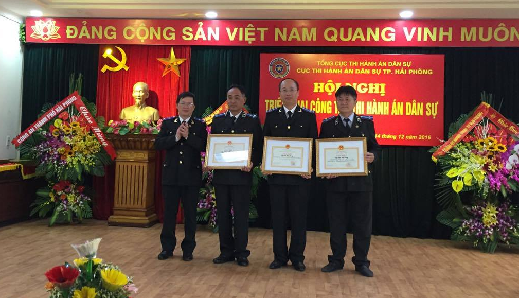 Ghi nhận và động viên những tập thể, cá nhân có thành tích suất sắc trong phong trào thi đua năm 2017, Bộ trưởng Bộ Tư pháp, Tổng cục trưởng Tổng cục thi hành án dân sự, Chủ tịch UBND thành phố đã tặng Bằng khen, Giấy khen cho các tập thể và cá nhân đã có thành tích xuất sắc trong trong phong trào thi đua Ngành Tư pháp về tiếp tục, đẩy mạnh học tập và làm theo tấm gương đạo đức Hồ Chí Minh giai đoạn 2012-2015 và năm công tác 2016 của các cơ quan Thi hành án dân sự thành phố Hải Phòng. Thừa ủy quyền của Tổng cục trưởng, đồng chí Mai Lương Khôi đã trao Giấy khen cho đồng chí Trần Hồng Quang- Cục trưởng Cục Thi hành án dân sự thành phố đã có nhiều cố gắng, nỗ lực trong lãnh đạo, quản lý, điều hành công tác thi hành án dân sự năm 2016. Động viên, khích lệ tinh thần làm việc của cán bộ, công chức, người lao động các cơ quan thi hành án dân sự, Cục trưởng Cục Thi hành án dân sự thành phố đã tặng Giấy khen cho 07 tập thể và 46 cá nhân đạt thành tích cao trong năm công tác 2016. Đồng thời tổ chức phát động phong trào thi đua và ký giao ước thi đua giữa các Chi cục Thi hành án dân sự quận, huyện phấn đấu hoàn thành các chỉ tiêu, nhiệm vụ được giao trong năm 2017, tạo không khí thi đua sôi nổi ngay từ đầu năm công tác.