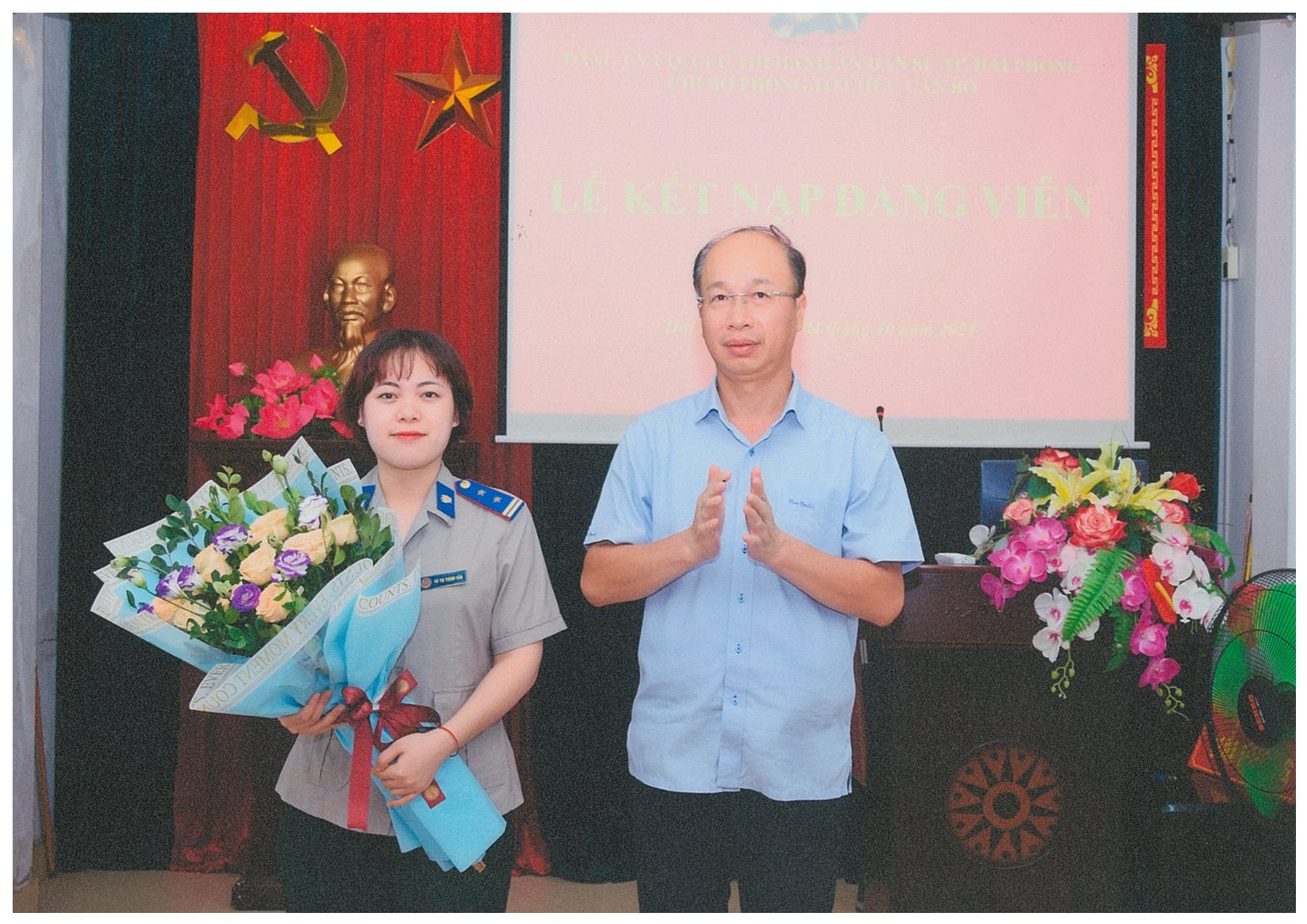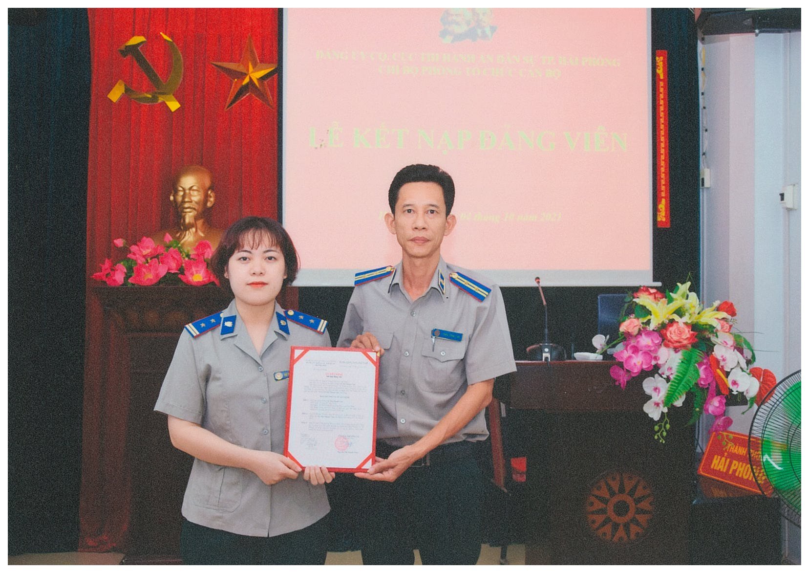 Hòa chung khí thế, thi đua sôi nổi cùng Đảng bộ cơ quan Cục Thi hành án dân sự thành phố phấn đấu thực hiện thắng lợi các chỉ tiêu, nhiệm vụ lập thành tích thiết thực kỷ niệm 76 năm ngày quốc khánh 02/9/1945 - 02/9/2021 và các ngày Lễ lớn của đất nước và thành phố. Ngày 04/10/2021, Chi bộ Phòng Tổ chức cán bộ cơ quan Cục Thi hành án dân sự thành phố tổ chức Lễ kết nạp Đảng viên đối với quần chúng ưu tú Vũ Thị Thanh Vân (Thư ký Thi hành án). Đến dự lễ kết nạp, có đồng chí Trần Hồng Quang, Bí thư Đảng ủy, Cục trưởng Cục Thi hành án dân sự thành phố, đồng chí Phó Bí thư Đảng ủy, các đồng chí Bí thư các Chi bộ trực thuộc, các đồng chí đại diện tổ chức - chính trị cơ quan cùng toàn thể đảng viên Chi bộ Phòng Tổ chức cán bộ.