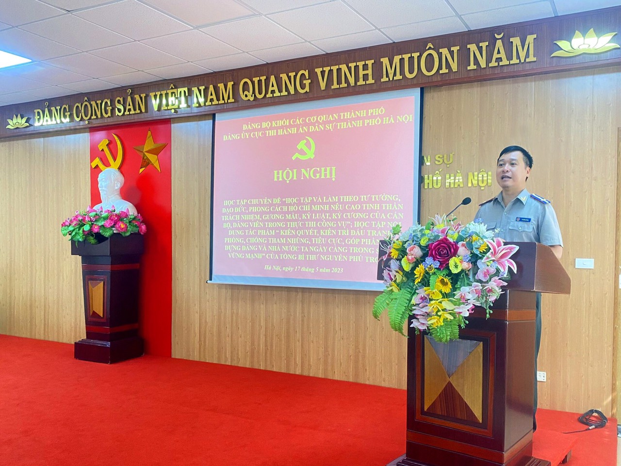Ngày 17/5/2023, Đảng bộ Cục Thi hành án dân sự thành phố Hà Nội tổ chức Hội nghị học tập chuyên đề “ Học tập và làm theo tư tưởng, đạo đức, phong cách Hồ Chí Minh nêu cao tinh thần trách nhiệm, gương mẫu, kỷ luật, kỷ cương của cán bộ, đảng viên trong thực thi công vụ” và Học tập nội dung tác phẩm “Kiên quyết, kiên trì đấu tranh phòng, chống tham nhũng, tiêu cực, góp phần xây dựng Đảng và Nhà nước ta ngày càng trong sạch, vững mạnh” của đồng chí Tổng Bí thư Nguyễn Phú Trọng; trao thưởng các cá nhân có thành tích suất sắc trong học tập và làm theo tư tưởng, đạo đức, phong cách Hồ Chí Minh.