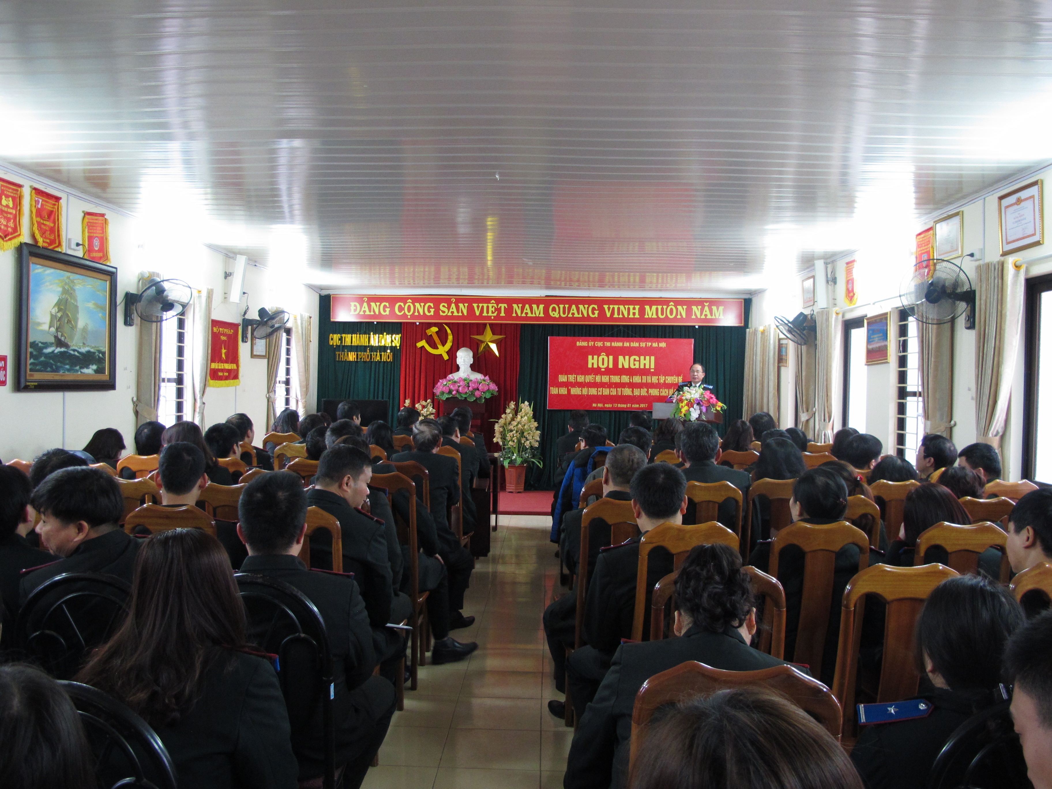 Thực hiện Kế hoạch số 26 -KH/TU ngày 05/12/2016 của Ban Thường vụ Thành ủy Hà Nội, Kế hoạch số 29 -KH/ĐUK ngày 14/12/2016 của Ban Thường vụ Đảng ủy Khối các cơ quan thành phố Hà Nội, Kế hoạch số 21-KH/ĐUC ngày 29/12/2016 của Đảng ủy Cục Thi hành án dân sự thành phố Hà Nội về việc “Tổ chức quán triệt, tuyên truyển, triển khai thực hiện Nghị quyết Hội nghị lần thứ tư Ban Chấp hành Trung ương Đảng ( khóa XII) và học tập Chuyên đề toàn khóa “Những nội dung cơ bản của tư tưởng, đạo đức, phong cách Hồ Chí Minh”, ngày 13/01/2017 Đảng ủy Cục Thi hành án dân sự thành phố Hà Nội tổ chức Hội nghị quán triệt các Nghị quyết, kết luận của Hội nghị TW 4 khóa XII và học tập chuyên đề toàn khóa “Những nội dung cơ bản của tư tưởng, đạo đức, phong cách Hồ Chí Minh” cho toàn thể đảng viên, công chức, người lao động Cục và các đồng chí Chi cục trưởng Chi cục Thi hành án dân sự quận, huyện, thị xã trực thuộc.