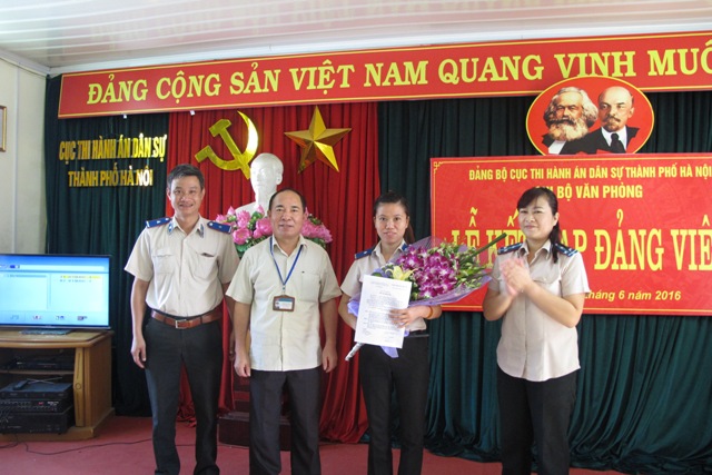 Sáng ngày 21/6/2016, Chi bộ Văn phòng - Cục Thi hành án dân sự Thành phố Hà Nội đã long trọng tổ chức Lễ kết nạp đảng viên cho quần chúng ưu tú Phùng Thị Hồng Loan. Đến dự buổi Lễ có đồng chí Lê Quang Tiến - Bí thư Đảng ủy, Cục trưởng cùng các đồng chí trong Đảng ủy Cục, đại diện các Chi bộ và Đoàn TNCSHCM và toàn thể Đảng viên thuộc Chi bộ Văn phòng Cục THADS TP Hà Nội.