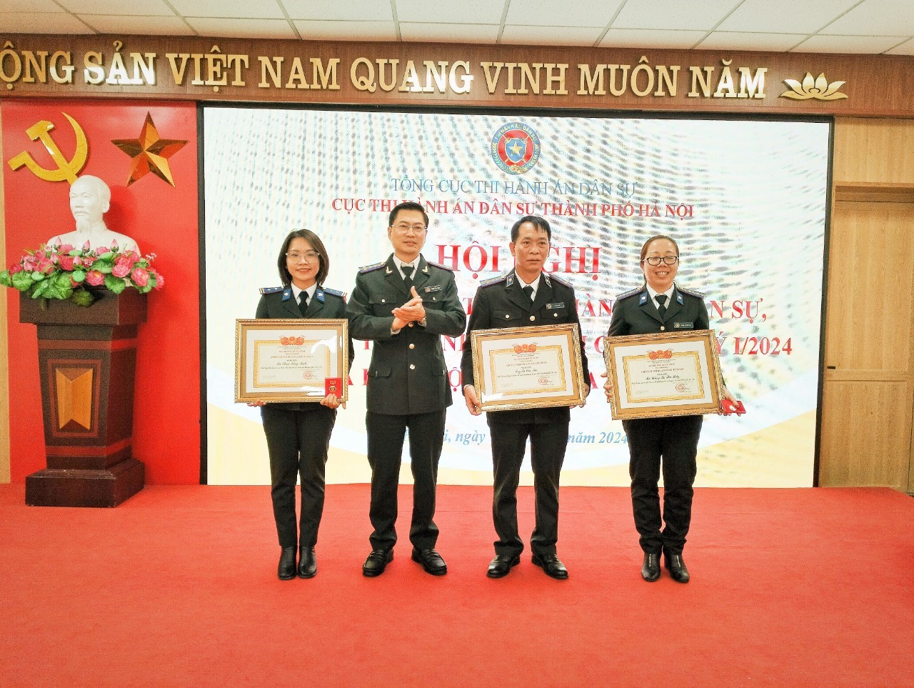 Tại Hội nghị, thừa ủy quyền của Bộ trưởng Bộ Tư pháp, Lãnh đạo Cục THADS thành phố Hà Nội đã trao Quyết định công nhận danh hiệu cho Tập thể lao động xuất sắc năm 2023, danh hiệu Chiến sỹ thi đua Ngành tư pháp và Bằng khen của Bộ trưởng Bộ Tư pháp cho các tập thể, cá nhân có thành tích xuất sắc trong công tác thi hành án dân sự.