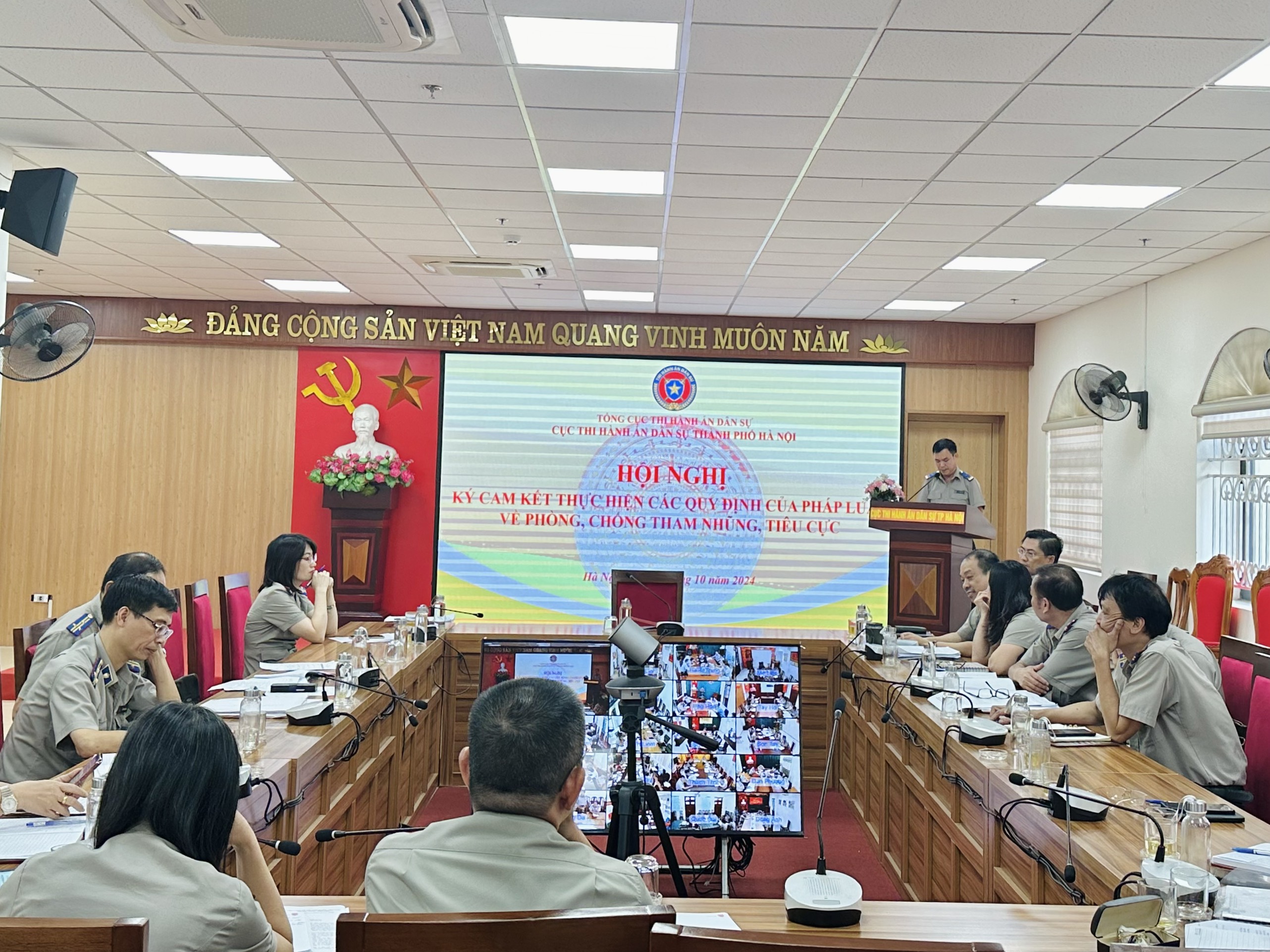 Tiếp theo chương trình, Cục Thi hành án dân sự thành phố Hà Nội tổ chức triển khai Ký cam kết thực hiện các quy định về phòng, chống tham nhũng, tiêu cực, nhằm bảo đảo thực hiện đồng bộ các chủ trương, đường lối của Đảng, chính sách, pháp luật của Nhà nước về phòng, chống tham nhũng, tiêu cực trong hệ thống cơ quan THADS thành phố Hà Nội, các văn bản chỉ đạo, quán triệt, Kế hoạch, Chương trình hành động của Ban cán sự đảng Bộ Tư pháp, Lãnh đạo Bộ, Lãnh đạo Tổng cục THADS và các cơ quan có thẩm quyền khác về công tác phòng, chống tham nhũng, tiêu cực.