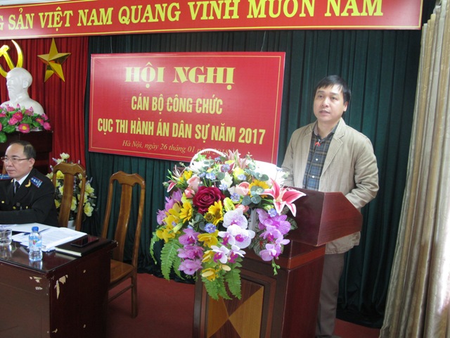 | Đ/c Vũ Hồng Dương – Phó Cục trưởng, Chủ tịch Công đoàn Cục Thi hành án dân sự thành phố Hà Nội phát biểu tại Hội nghị |
