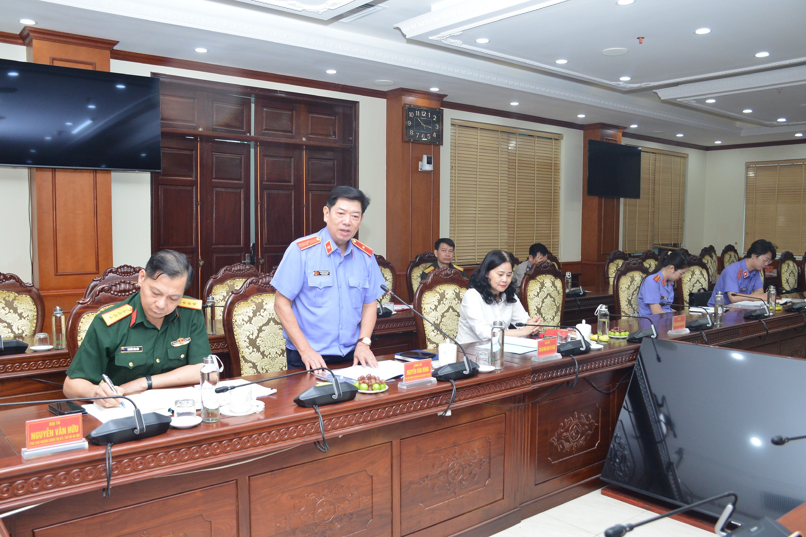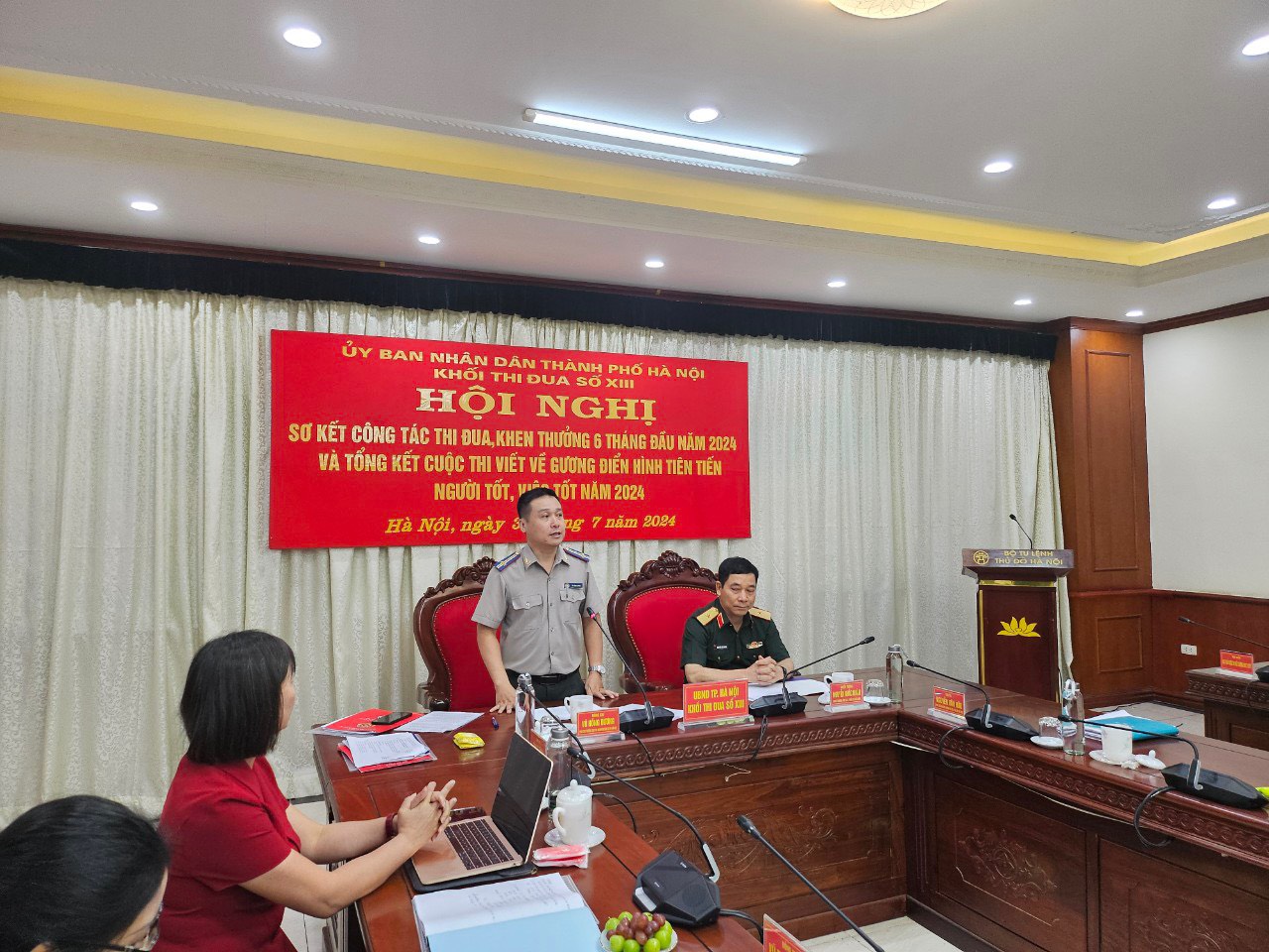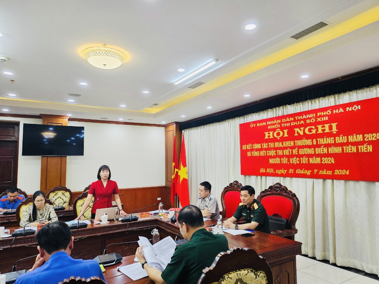 Đồng chí Vũ Hồng Dương, Phó cục trưởng Cục Thi hành án dân sự thành phố Hà Nội - đại diện đơn vị Khối trưởng trình bày báo cáo sơ kết công tác thi đua khen thưởng 6 tháng đầu năm 2024, tổng kết cuộc thi viết về gương điển hình tiên tiến (ĐHTT), người tốt việc tốt (NTVT) của Khối thi đua số XIII. Trong 6 tháng đầu năm 2024, Khối thi đua số XIII Thành phố đã phấn đấu hoàn thành xuất sắc nhiệm vụ chính trị được Thành phố và các Bộ, Ngành giao cho. Đã triển khai và thực hiện nghiêm túc nội dung, chỉ tiêu thi đua, tập trung vào các nhiệm vụ công tác trọng tâm được xác định từ đầu năm, làm tốt công tác tham mưu, phục vụ UBND Thành phố và các Bộ, Ngành ban hành nhiều văn bản chỉ đạo các sở, ban, ngành, UBND các quận, huyện, thị xã tăng cường các biện pháp đảm bảo quốc phòng, an ninh trật tự trên địa bàn quản lý và tăng cường nguồn lực, nâng cao năng lực chiến đấu cho các lực lượng. Công tác chỉ đạo, tổ chức các phong trào thi đua có nhiều đổi mới, phù hợp với tính chất, yêu cầu nhiệm vụ của từng đơn vị; nhiều tập thể, cá nhân lập nhiều tình tích đã được khen thưởng đột xuất kịp thời.