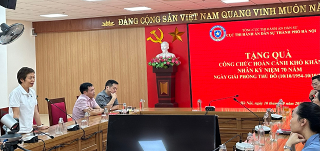 Sáng 10/10/2024, Cục Thi hành án dân sự thành phố Hà Nội đã tổ chức buổi Thăm hỏi tặng quà cho công chức có hoàn cảnh khó khăn. Đây là việc làm có ý nghĩa thiết thực nhằm động viên cán bộ, công chức phấn đấu khắc phục khó khăn hoàn thành tốt nhiệm vụ được giao.