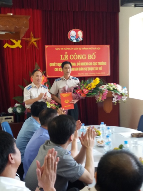Ngày 18/5/2016 tại Chi cục Thi hành án dân sự quận Tây Hồ, Cục Thi hành án dân sự thành phố Hà Nội tổ chức Lễ công bố Quyết định điều động, bổ nhiệm Chi cục trưởng Chi cục Thi hành án dân sự quận Tây Hồ đối với đồng chí Nguyễn Quốc Thành – nguyên Chi cục trưởng Chi cục Thi hành án dân sự huyện Gia Lâm. Dự Lễ công bố Quyết định có đồng chí Lê Quang Tiến – Bí thư Đảng ủy, Cục trưởng, đồng chí Nguyễn Thị Hậu – Phó Trưởng Phòng Tổ chức cán bộ Cục Thi hành án dân sự thành phố Hà Nội; Nguyễn Đình Khuyến - Phó Chủ tịch Ủy ban nhân dân quận Tây Hồ, đại diện lãnh đạo Tòa án nhân dân và đại diện lãnh đạo Viện Kiểm sát nhận dân quận Tây Hồ.