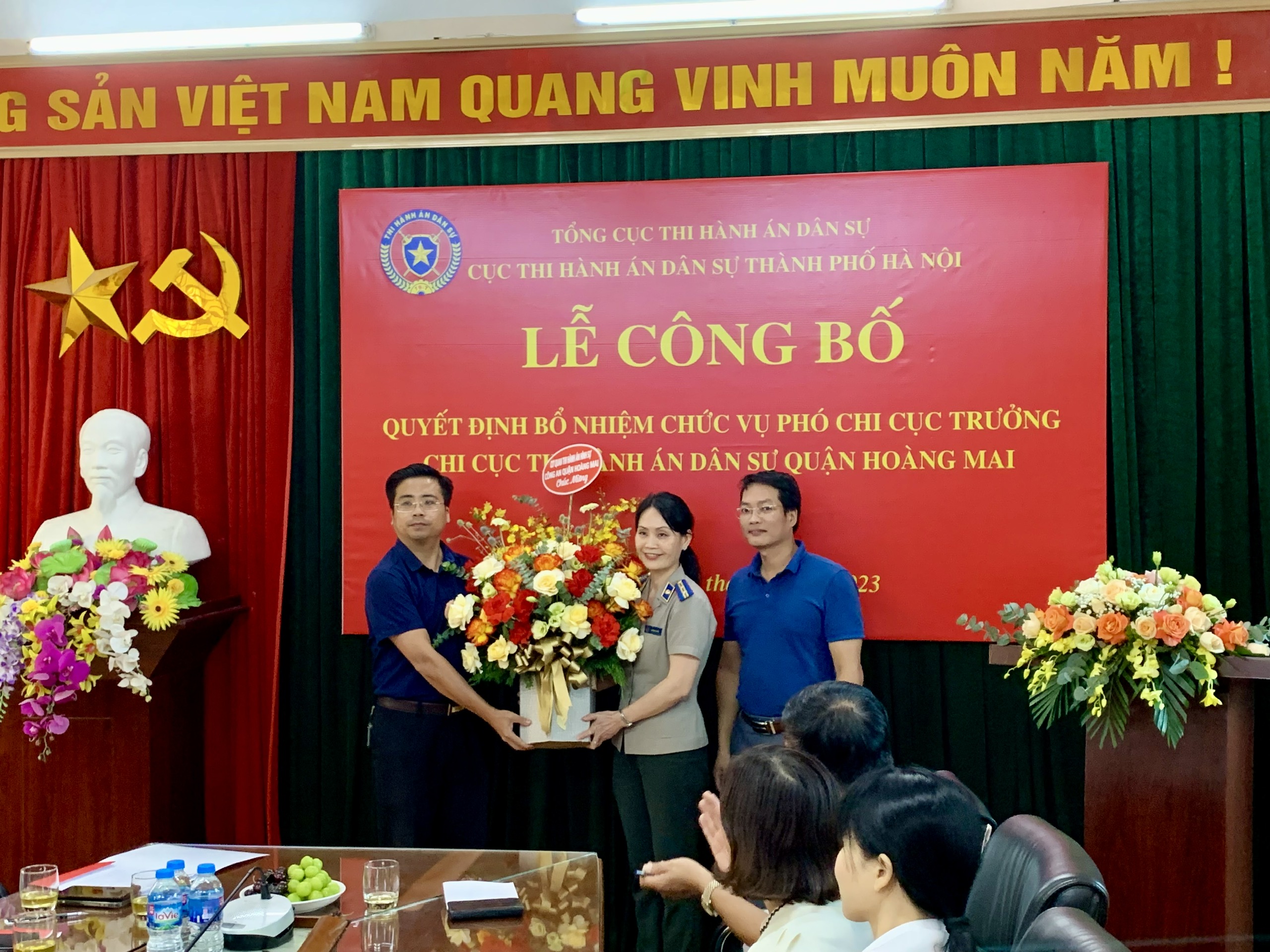 Thực hiện kế hoạch công tác tổ chức cán bộ năm 2023; Thực hiện công tác kiện toàn chức danh lãnh đạo các cơ quan Thi hành án dân sự thành phố Hà Nội. Ngày 15 tháng 8 năm 2023 tại Chi cục Thi hành án dân sự quận Hoàng Mai, Cục Thi hành án dân sự thành phố Hà Nội long trọng tổ chức Lễ công bố Quyết định bổ nhiệm đồng chí Nguyễn Thị Thủy – Chấp hành viên sơ cấp Chi cục Thi hành án dân quận Hoàng Mai, thành phố Hà Nội giữ chức vụ Phó Chi cục trưởng Chi cục Thi hành án dân sự quận Hoàng Mai, thành phố Hà Nội. Tham dự Lễ công bố Quyết định có đồng chí Vũ Hồng Dương - Phó Bí thư Đảng ủy, Phó Cục trưởng; đồng chí Lê Quang Chuyển - Trưởng Phòng Tổ chức cán bộ Cục Thi hành án dân sự thành phố Hà Nội; đồng chí Đàm Tiến Thắng - Ủy viên Ban thường vụ Quận ủy, Phó Chủ tịch UBND quận, Trưởng ban Chỉ đạo THADS quận Hoàng Mai; đại diện lãnh đạo Ban Tổ chức Quận ủy, Tòa án nhân dân, Viện kiểm sát nhân dân và Công an quận Hoàng Mai...