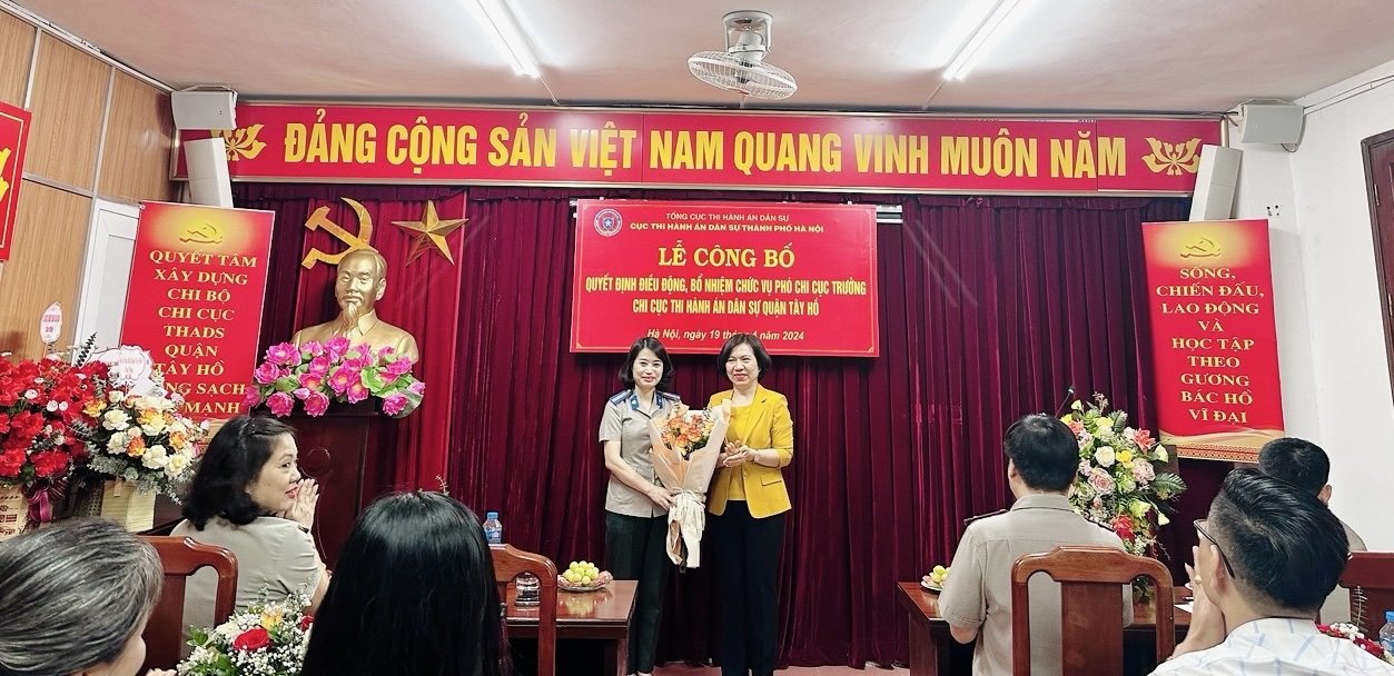 Ngày 19 tháng 4 năm 2024 Cục Thi hành án dân sự thành phố Hà Nội long trọng tổ chức Lễ công bố Quyết định bổ nhiệm đồng chí Tạ Hồng Hạnh - Chấp hành viên sơ cấp Chi cục Thi hành án dân sự quận Cầu Giấy, thành phố Hà Nội giữ chức vụ Phó Chi cục trưởng Chi cục Thi hành án dân sự quận Tây Hồ, thành phố Hà Nội.