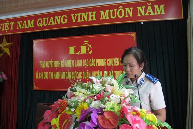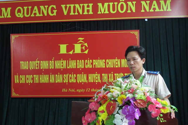 Thay mặt Lãnh Đạo Cục, đồng Chí Lê Quang Tiến - Bí thư Đảng ủy, Cục trưởng Cục Thi hành án dân sự thành phố Hà Nội trao Quyết định bổ nhiệm đồng thời phát biểu chúc mừng và giao nhiệm vụ yêu cầu các đồng chí được bổ nhiệm phải tiếp tục phát huy những kết quả đã đạt được, thể hiện được vai trò của người lãnh đạo luôn gương mẫu đi đầu trong mọi hoạt động của đơn vị; xây dựng tập thể Lãnh đạo đơn vị thống nhất, đoàn kết, hoạt động có hiệu quả; tranh thủ được sự lãnh đạo, chỉ đạo của cấp ủy và chính quyền; phối hợp tốt với các cơ quan, Ban, Ngành ở địa phương trong công tác thi hành án dân sự; tiếp tục phấn đấu tổ chức thực hiện việc thi hành án đạt và vượt chỉ tiêu được giao; không ngừng tự trau dồi phẩm chất chính trị, không ngừng nâng cao năng lực lãnh đạo, quản lý và chuyên môn nghiệp vụ; khiêm tốn, chủ động, sáng tạo, có tinh thần trách nhiệm công việc.