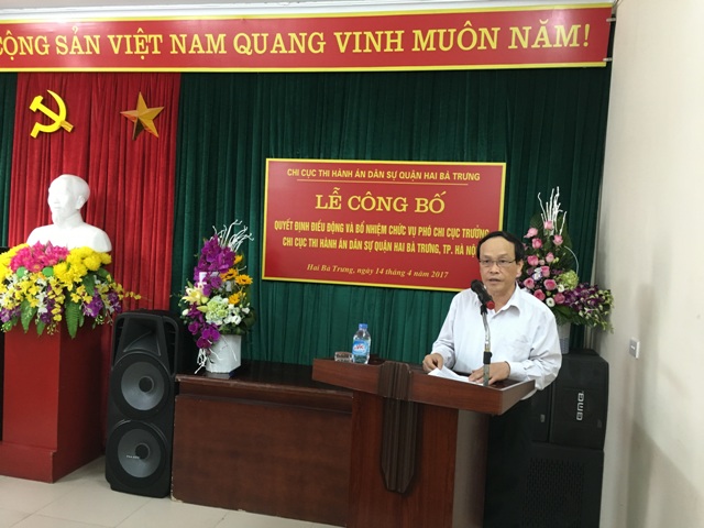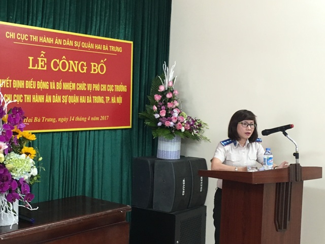 Thực hiện công tác kiện toàn chức danh lãnh đạo quản lý các cơ quan thi hành án dân sự thành phố Hà Nội, Cục Thi hành án dân sự thành phố Hà Nội đã phối hợp với Quận ủy, Ủy ban nhân dân quận Hai Bà Trưng; Quận ủy, Ủy ban nhân dân quận Long Biên thực hiện quy trình điều động và bổ nhiệm đồng chí Đặng Thị Thanh Vân - Phó Chi cục trưởng Chi cục Thi hành án dân sự quận Long Biên giữ chức vụ Phó Chi cục trưởng Chi cục Thi hành án dân sự quận Hai Bà Trưng, thành phố Hà Nội. Ngày 14/4/2017, Cục Thi hành án dân sự thành phố Hà Nội long trọng tổ chức Lễ công bố quyết định điều động và bổ nhiệm đồng chí Đặng Thị Thanh Vân giữ chức vụ Phó Chi cục trưởng Chi cục Thi hành án dân sự quận Hai Bà Trưng.