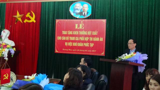 Việc khen thưởng đột xuất cho các tập thể và cá nhân có thành tích trong việc phối hợp và tổ chức thi hành án là hoạt động thường xuyên của Cục Thi hành án dân sự thành phố Hà Nội nhằm ghi nhận những đóng góp, phối hợp của các tập thể, cá nhân trong và ngoài ngành đối với công tác Thi hành án dân sự. Ngày 18/01/2017 Cục Thi hành án dân sự thành phố Hà Nội long trọng tổ chức lễ trao quyết định khen thưởng và giấy khen cho các cá nhân có thành tích xuất sắc trong việc phối hợp thi hành án. Đến dự buổi Lễ, về phía Cục Thi hành án dân sự thành phố Hà Nội có đồng chí Dương Minh Công – Phó Cục trưởng, Phó Chủ tịch thường trực Hội đồng thi đua khen thưởng Cục Thi hành án dân sự thành phố Hà Nội, đồng chí Nguyễn Thị Hậu – Phó Trưởng phòng Tổ chức cán bộ.
