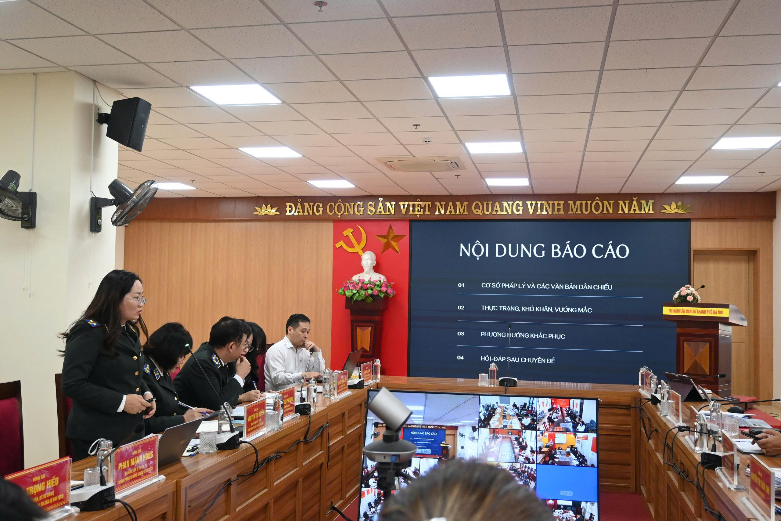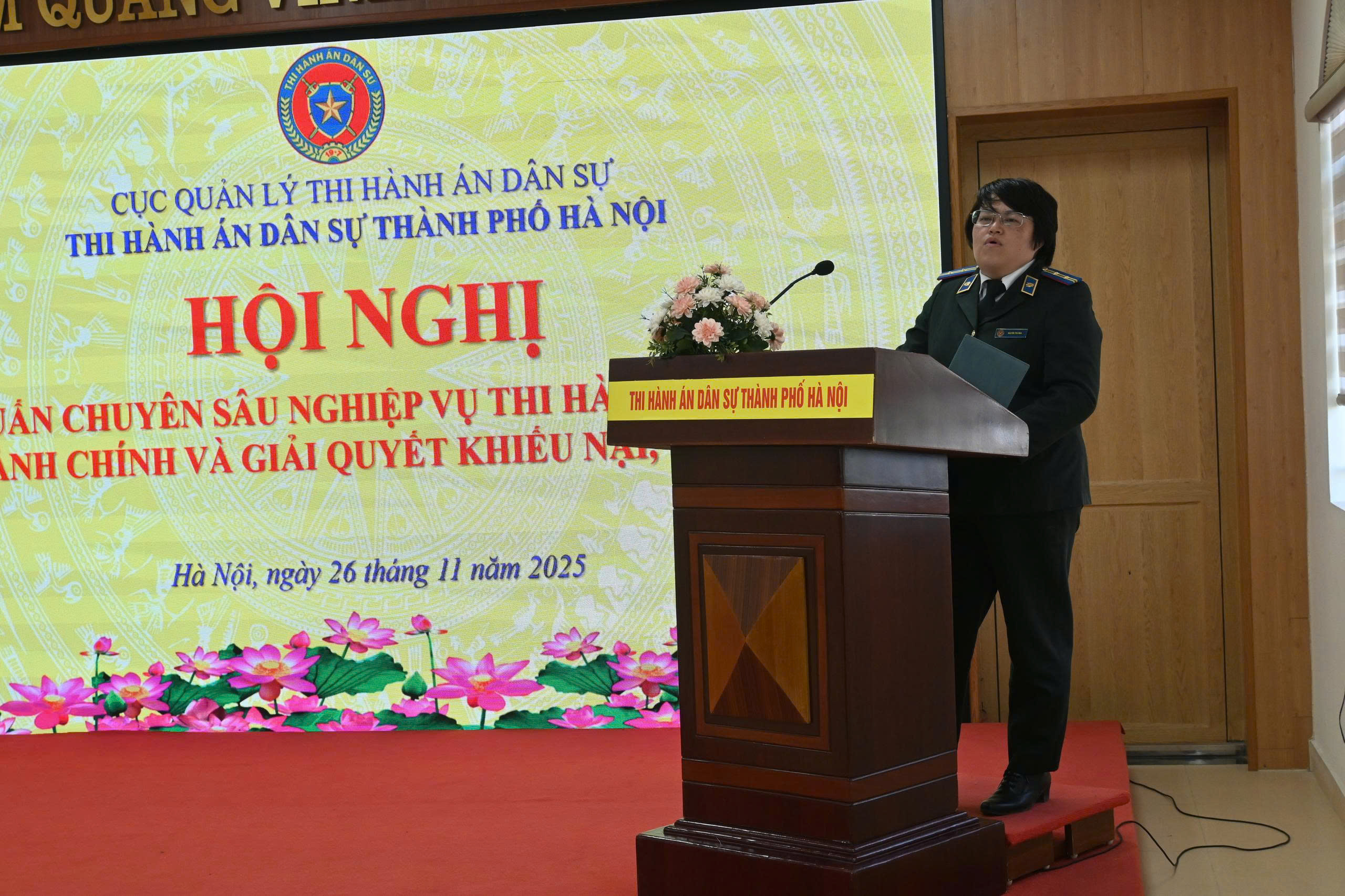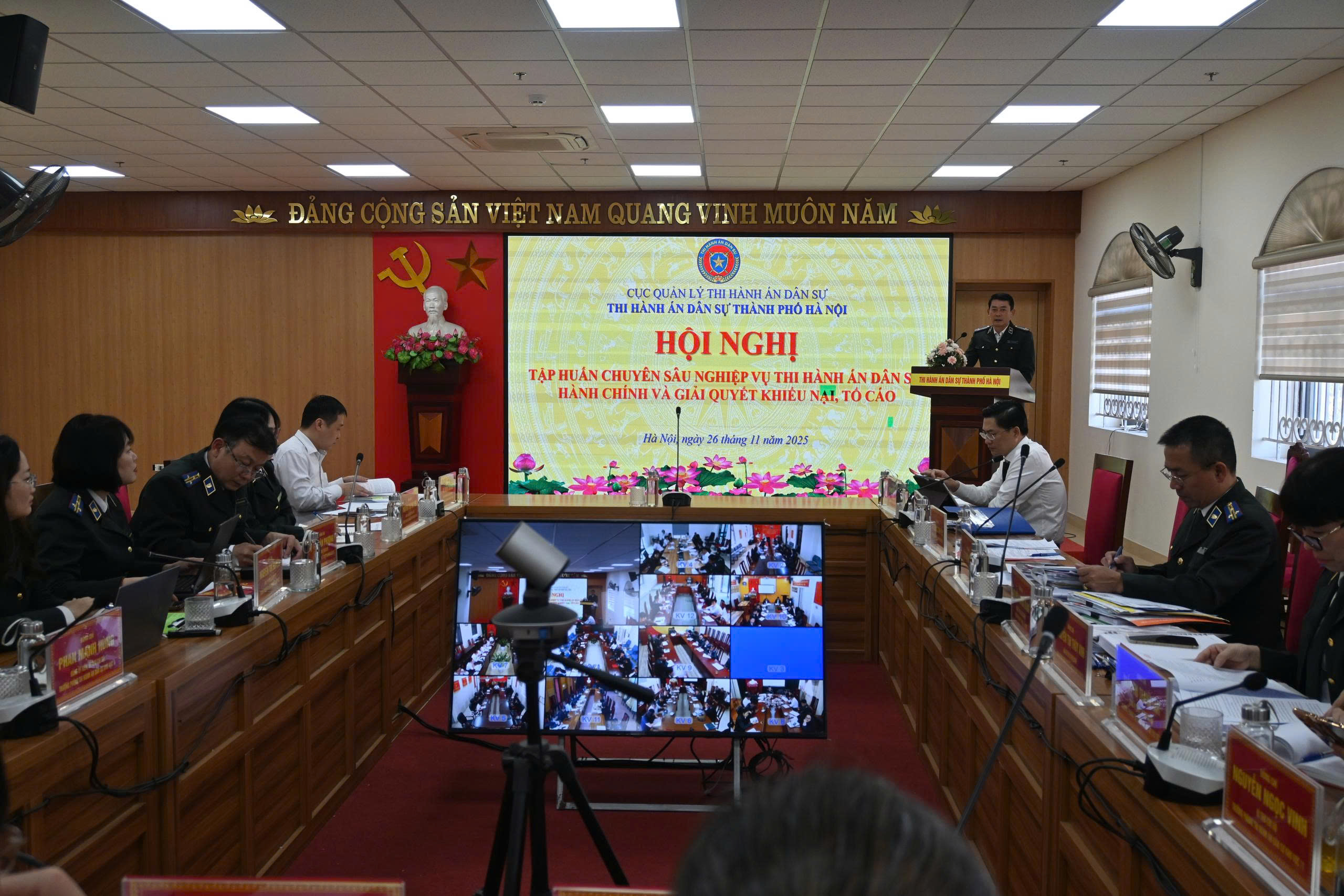 Thực hiện Kế hoạch số 04-KH/ĐU ngày 21/10/2025 của Đảng ủy Thi hành án dân sự thành phố Hà Nội về việc tổ chức tập huấn nghiệp vụ công tác Đảng năm 2025 và Kế hoạch số 03/KH-THADS ngày 22/10/2025 của Thi hành án dân sự thành phố Hà Nội về việc tổ chức Hội nghị tập huấn chuyên sâu nghiệp vụ thi hành án dân sự, hành chính và giải quyết khiếu nại, tố cáo, ngày 26/11/2025, Thi hành án dân sự (THADS) thành phố Hà Nội tổ chức Hội nghị tập huấn nghiệp vụ công tác Đảng năm 2025 cho toàn bộ Đảng viên thuộc cơ quan THADS thành phố Hà Nội trong buổi sáng và tổ chức Hội nghị tập huấn chuyên sâu nghiệp vụ thi hành án dân sự, hành chính và giải quyết khiếu nại, tố cáo cho đội ngũ các Chấp hành viên, Thẩm tra viên, Thư ký thi hành án thuộc cơ quan THADS thành phố Hà Nội vào buổi chiều. Đồng chí Phạm Văn Dũng – Bí thư Đảng ủy, Trưởng THADS thành phố Hà Nội, chủ trì Hội nghị trực tuyến tại 13 điểm cầu, tham dự lớp tập huấn tại các điểm cầu gồm có Lãnh đạo THADS, Lãnh đạo các phòng chuyên môn, Lãnh đ...