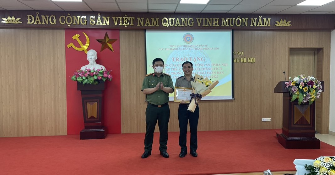 Chiều ngày 13/4/2023, Công an thành phố Hà Nội tổ chức trao tặng Giấy khen tập thể, cá nhân Cục Thi hành án dân sự thành phố Hà Nội có thành tích xuất sắc trong phong trào Toàn dân bảo vệ an ninh tổ quốc trên địa bàn thành phố Hà Nội năm 2022.