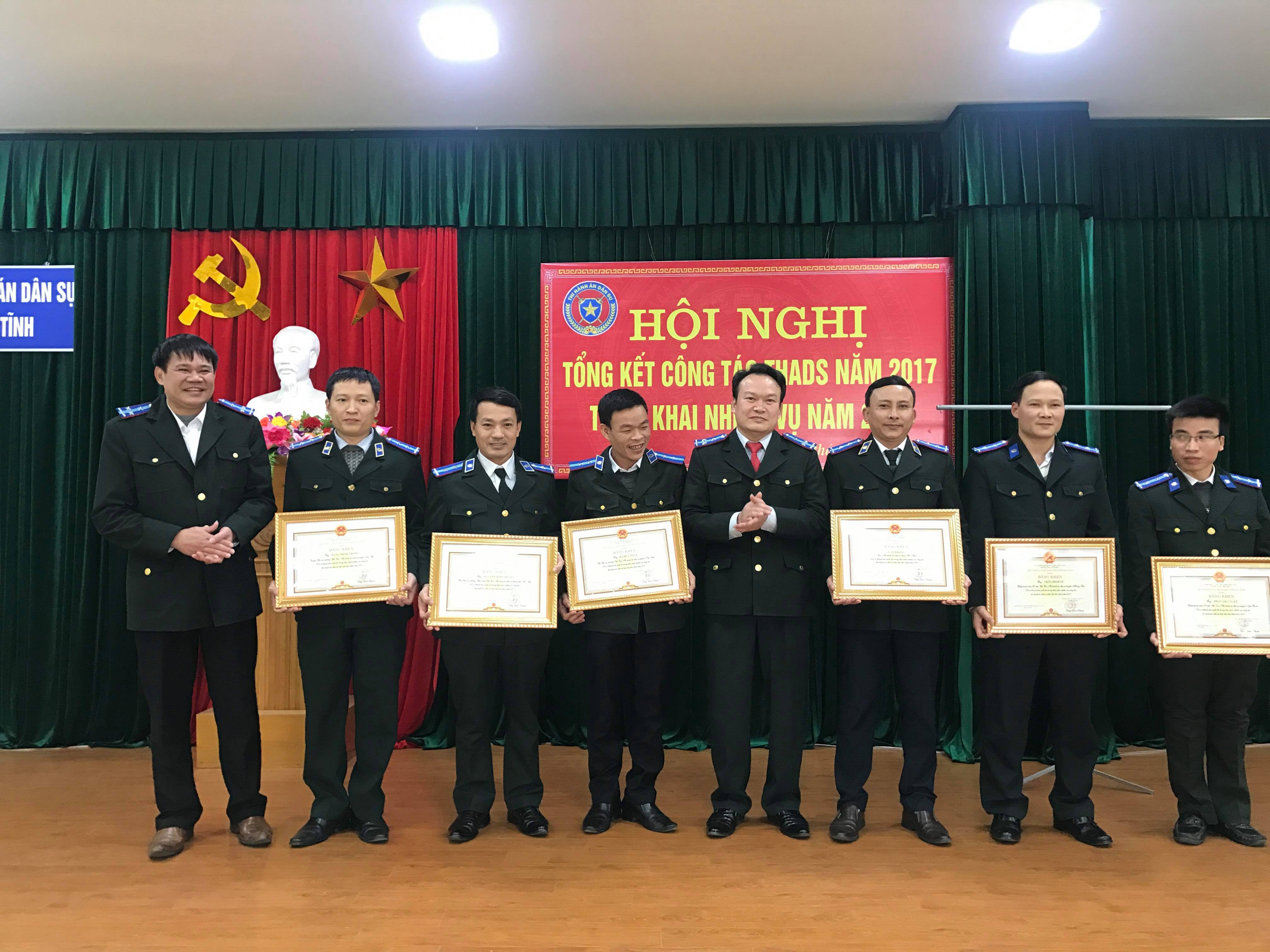Trên cơ sở thành tích kết quả công tác năm 2017, Cục THADS Hà Tĩnh đã trao cờ thi đua của UBND tỉnh Hà Tĩnh cho Chi cục THADS thị xã Kỳ Anh, trao Bằng khen của Bộ trưởng Bộ Tư pháp cho tập thể Văn phòng Cục THADS Hà Tĩnh, Chi cục THADS huyện Đức Thọ cùng các hình thức khen thưởng khác cho các tập thể, cá nhân đã có thành tích xuất sắc trong năm 2017. Các phòng thuộc Cục, các Chi cục THADS đã tiến hành ký giao ước thi đua nhằm tạo động lực phấn đấu hoàn thành chỉ tiêu, nhiệm vụ năm 2018.