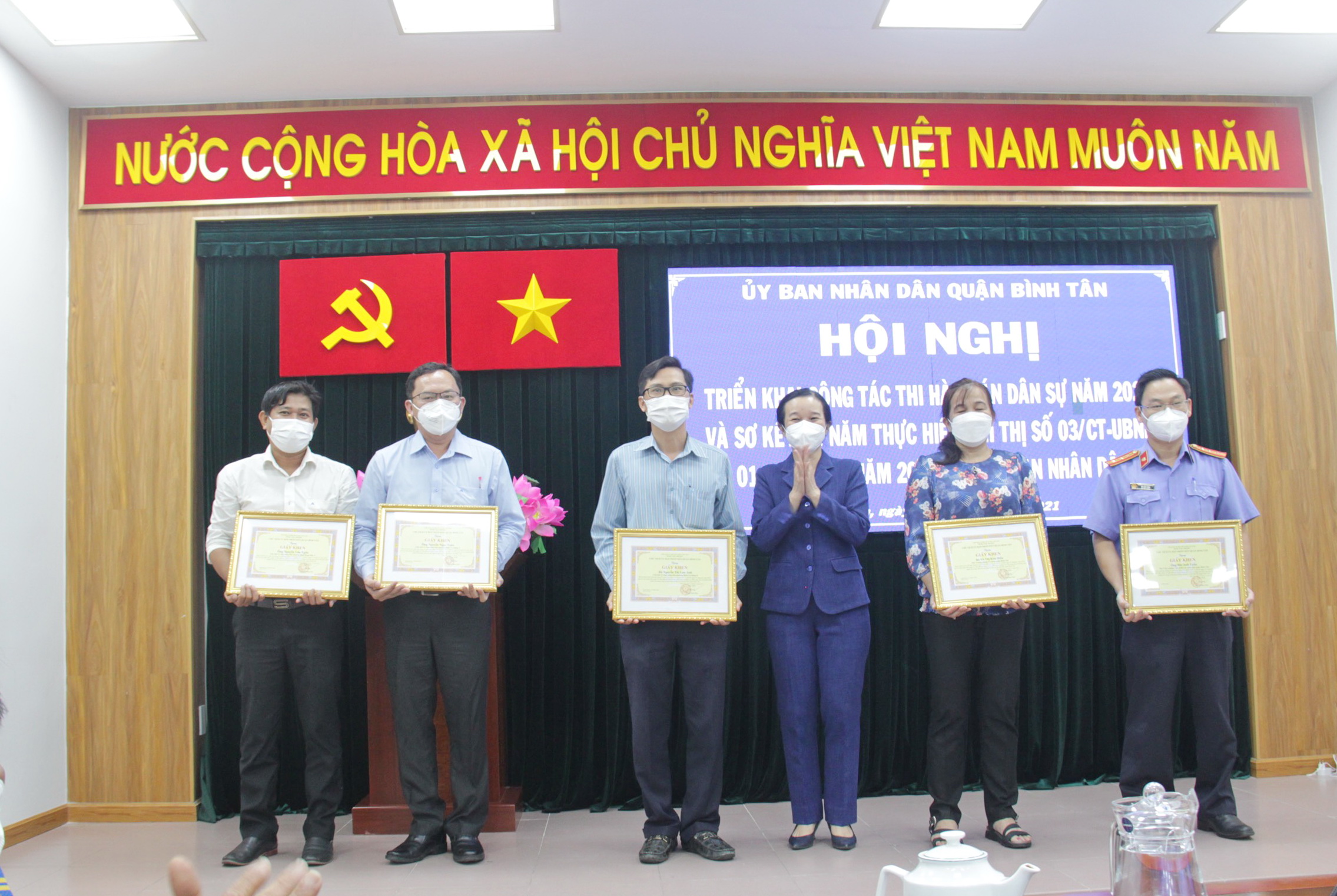 Nhân dịp này, để ghi nhận những kết quả trong quá trình phối hợp trong công tác THADS giữa các đơn vi trong quận, tổng kết 01 năm thực hiện Chỉ thị số 03/CT-UB, UBND Quận Bình Tân đã tặng Giấy khen cho 05 tập thể và 06 cá nhân.