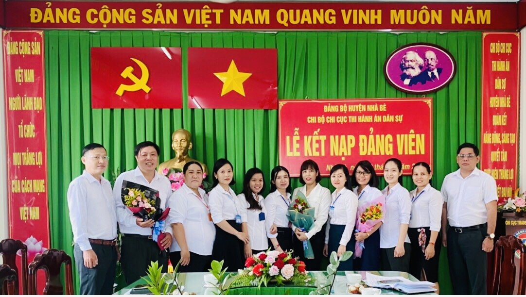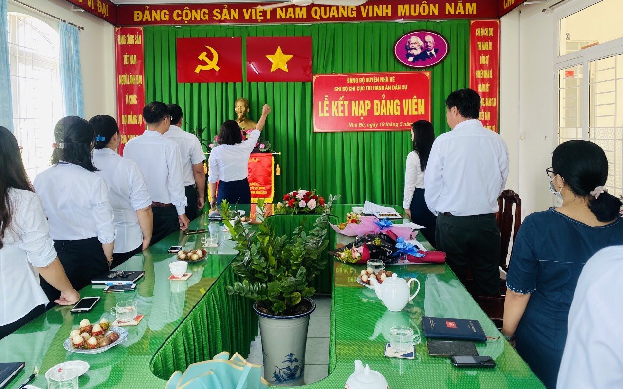 Nhân dịp kỉ niệm 131 năm Ngày sinh Chủ tịch Hồ Chí Minh (19/5/1890-19/5/2021), Chi bộ Chi cục Thi hành án dân sự (THADS) huyện Nhà Bè đã tổ chức Lễ kết nạp đảng viên cho 03 quần chúng ưu tú là đồng chí Châu Văn Quang, đồng chí Nguyễn Thị Huệ và đồng chí Nguyễn Thị Thương.