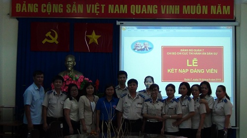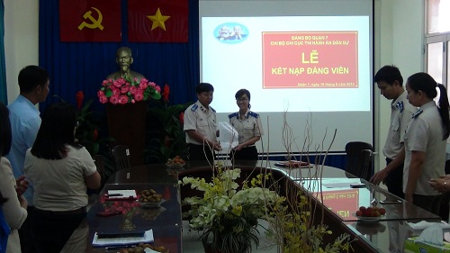 Trước đó, nhân kỷ niệm 70 năm ngày Truyền thống thi hành án dân sự Chi bộ Chi cục Thi hành án dân sự Quận 7 đã tổ chức Lễ kết nạp đảng cho quần chúng Trần Thanh Tâm, đến thời điểm hiện nay Chi bộ Chi cục Thi hành án dân sự Quận 7 đã hoàn thành 100% chỉ tiêu kết nạp Quần chúng vào Đảng theo kế hoạch công tác năm 2016.