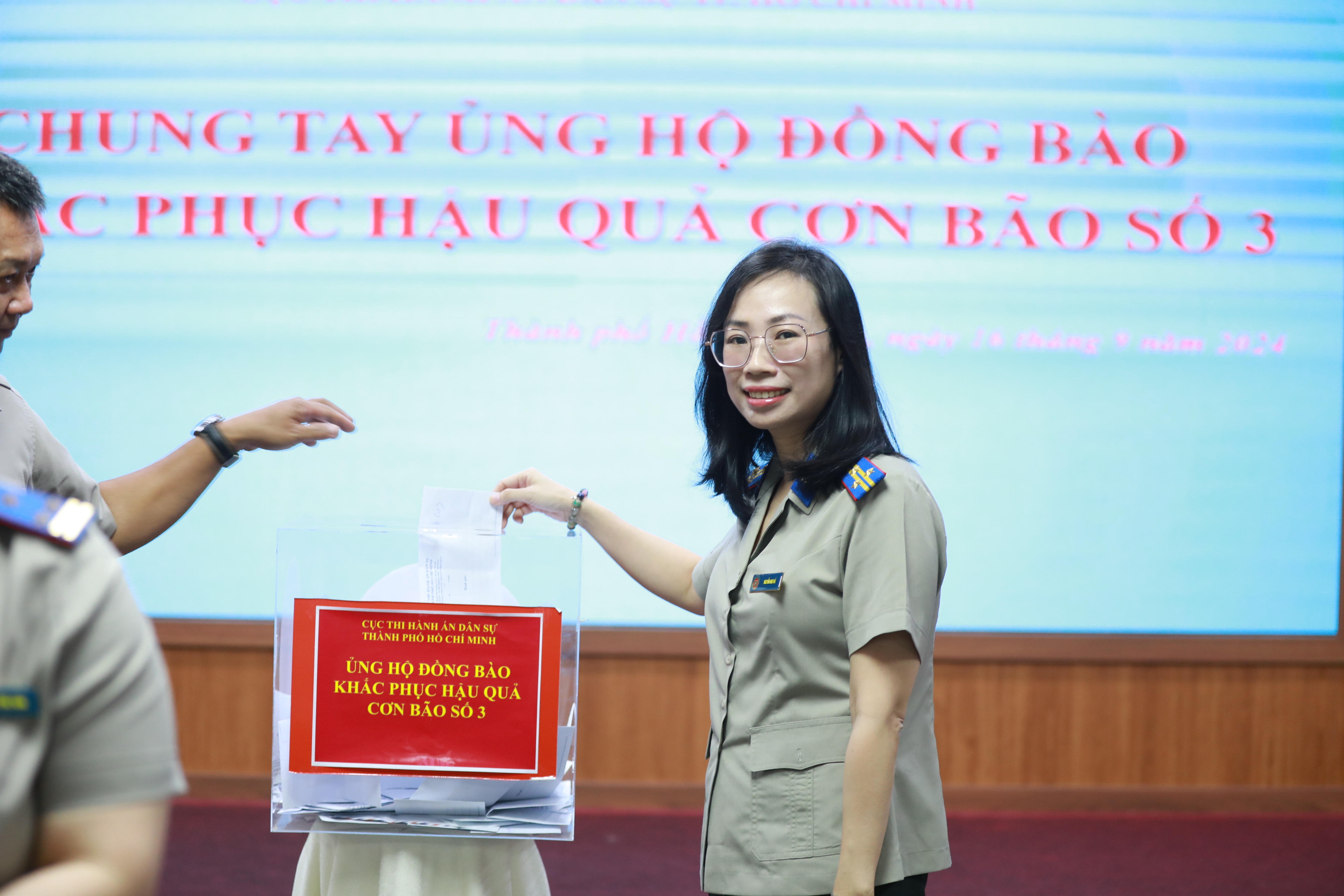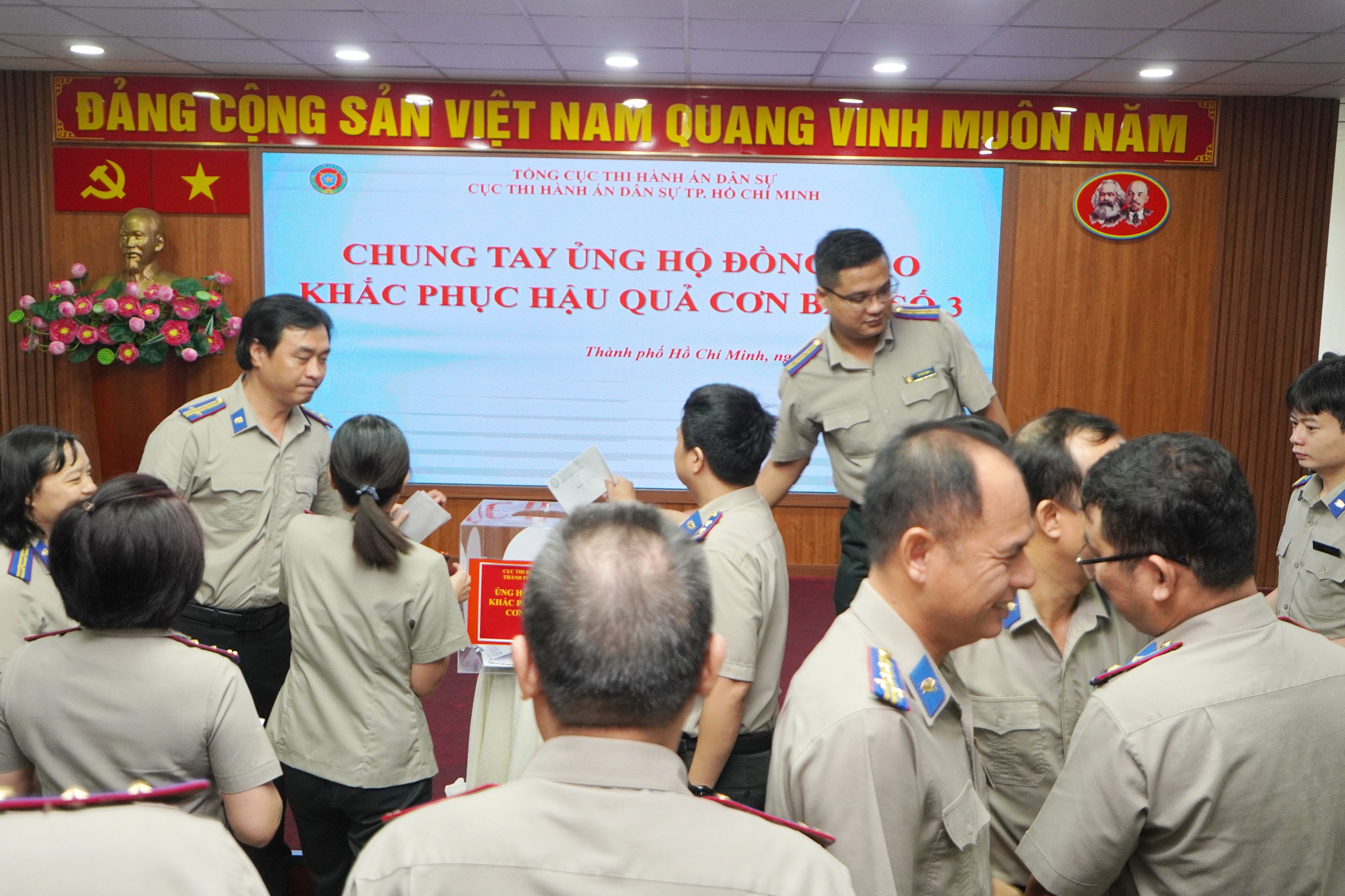 Sáng 16-9, thực hiện theo lời kêu gọi của Tổng cục THADS về việc chung tay động viên, chia sẻ và khắc phục thiệt hại do mưa lũ do Bão số 3 gây ra, Cục trưởng Cục THADS TP.HCM Nguyễn Văn Hòa đã kêu gọi và phát động công chức, người lao động các cơ quan THADS TP.HCM chia sẻ phần nào giúp công chức, người lao động THADS các cơ quan THADS tỉnh Tuyên Quang khắc phục hậu quả do lũ, Bão số 3 gây ra, sớm ổn định cuộc sống để yên tâm công tác.