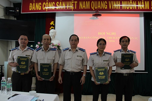 Đồng chí Nguyễn Văn Lực- Cục trưởng Cục Thi hành án dân sự Thành phố đã trao quyết định của Bộ Tư pháp bổ nhiệm lại chức vụ Phó Cục trưởng đối với đồng chí Võ Minh Hòa và Phạm Huy Hoàng. Đồng thời nhấn mạnh đây là niềm vinh dự của Cục Thi hành án dân sự thành phố nói chúng và cá nhân các đồng chí được bổ nhiệm nói riêng. Cục trưởng cũng đề nghị các đồng chí tiếp tục phát huy những kết quả công tác đã đạt được, khắc phục những tồn tại, hạn chế để cùng tập thể Ban lãnh đạo Cục Thi hành án dân sự xây dựng và phát triển đơn vị trưởng thành, xứng đáng là lá cờ đầu trong hệ thống Thi hành án dân sự của cả nước.