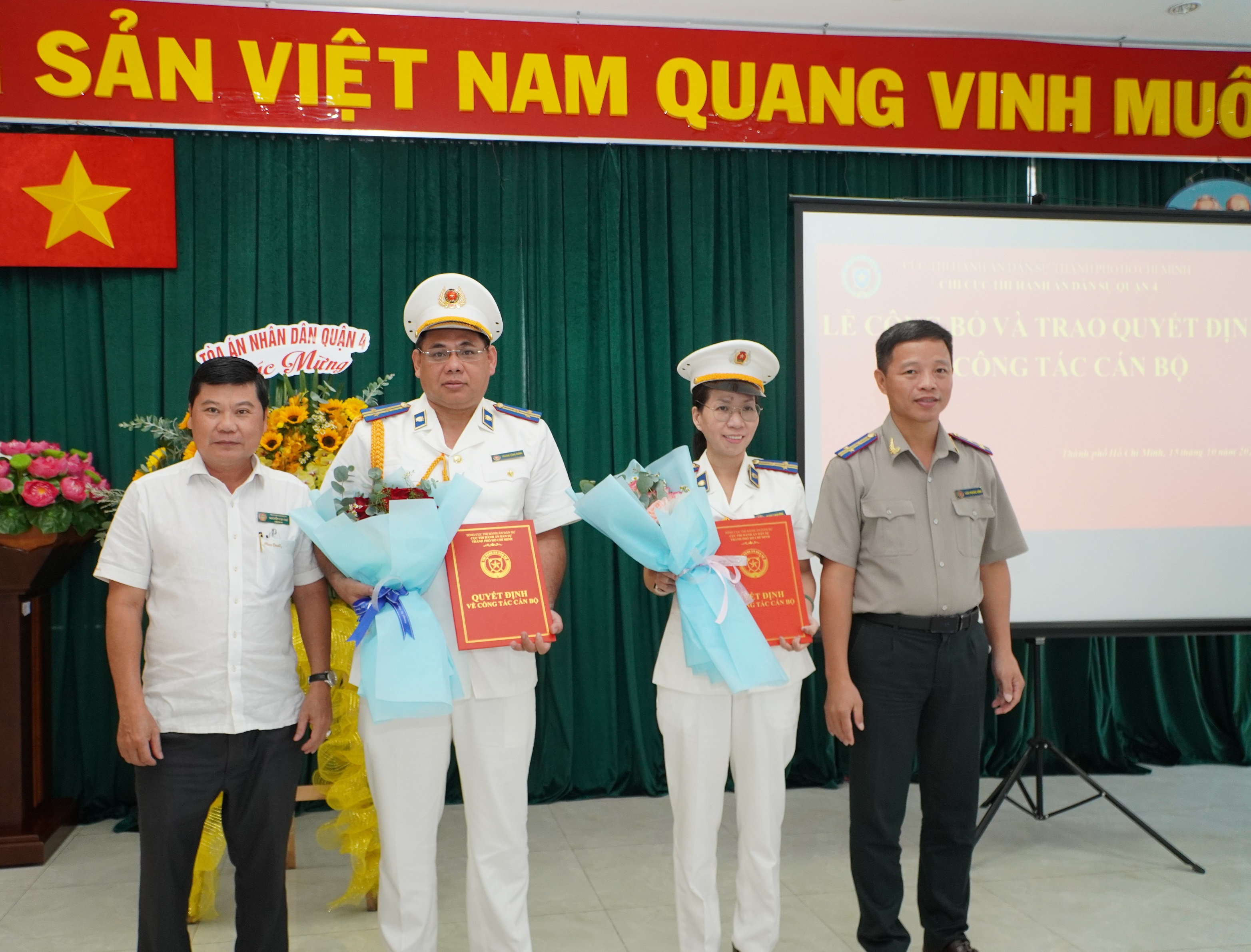 Sáng 15-10, tại Chi cục THADS huyện Nhà Bè và Chi cục THADS Quận 4, Cục Thi hành án dân sự Thành phố đã tổ chức Lễ công bố và trao Quyết định của Tổng cục trưởng Tổng cục THADS về việc điều động, bổ nhiệm Chi cục trưởng Chi cục THADS huyện Nhà Bè và Chi cục trưởng Chi cục THADS Quận 4, Thành phố Hồ Chí Minh. Ông Trần Phương Hồng, Thường vụ đảng ủy - Phó Cục trưởng chủ dự và chủ trì buổi lễ.