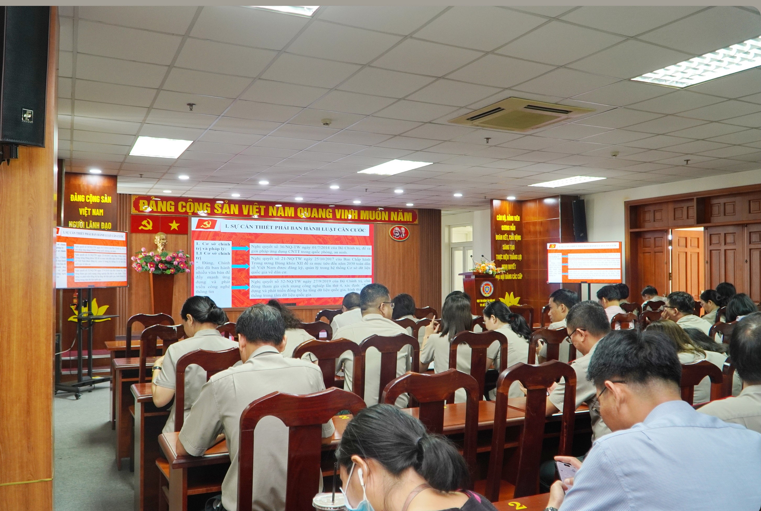 Sáng 08-8, tại Hội trường Lầu 11, Cục THADS TP.HCM, Đảng ủy Cục THADS TP đã tổ chức Hội nghị trực tuyến tuyên truyền Luật căn cước và Luật lực lượng tham gia bảo vệ trật tự an ninh ở cơ sở. Thành phần tham dự là Đảng ủy viên, cấp ủy các Chi bộ, đảng viên, công chức thuộc Cục THADS TP. Đây là Hội nghị do Thành ủy TPHCM tổ chức hội nghị trực tiếp và trực tuyến cho hơn 23.000 đại biểu tại 391 điểm cầu thuộc Thành ủy TP Thủ Đức và các quận ủy, huyện ủy; các đảng ủy cấp trên cơ sở trực thuộc Thành ủy; các sở, ban, ngành TP.