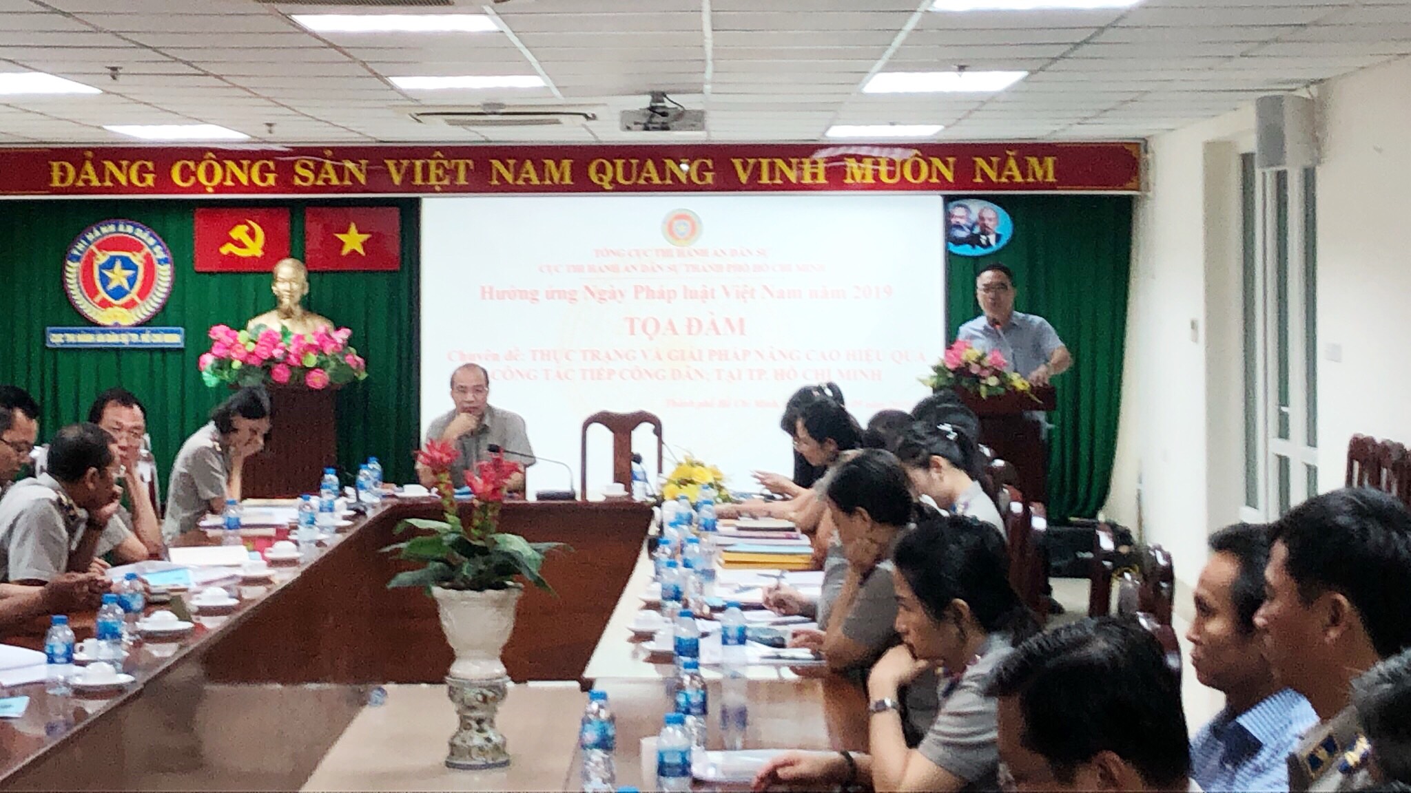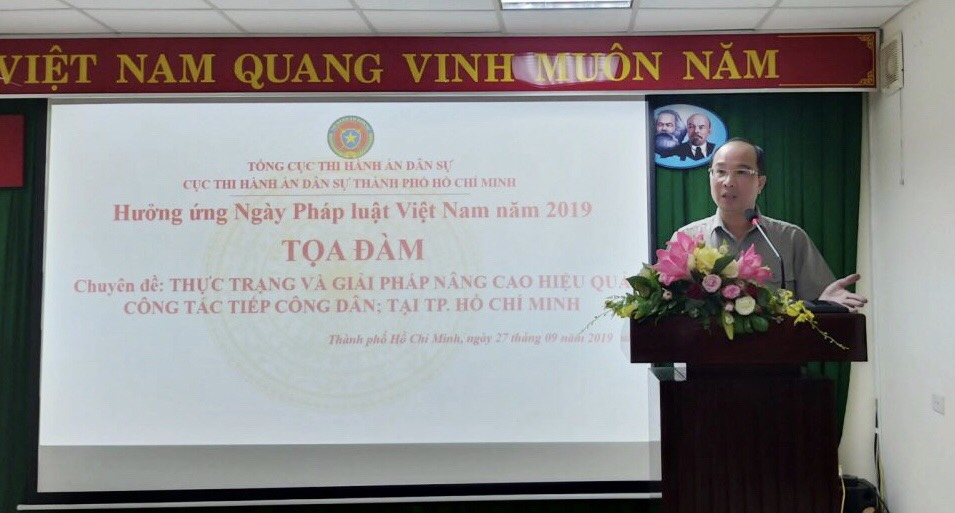 Thực hiện Kế hoạch công tác phổ biến giáo dục pháp luật của Cục Thi hành án dân sự TP.HCM năm 2019 ban hành kèm theo Quyết định số 1359/QĐ-CTHADS ngày 07/5/2019; Kế hoạch tổ chức Ngày pháp luật nước Cộng hòa xã hội chủ nghĩa Việt Nam năm 2019 của Cục THADS TP.HCM ban hành kèm theo Quyết định số 2154/QĐ-CTHADS ngày 13/9/2019; Kế hoạch tổ chức Tọa đàm chuyên đề Thực trạng và giải pháp nâng cao hiệu quả công tác tiếp công dân; giải quyết khiếu nại, tố cáo, đề nghị, kiến nghị, phản ánh trong thi hành án dân sự trên địa bàn thành phố Hồ Chí Minh ban hành kèm theo Quyết định số 1467/QĐ-CTHADS ngày 29/5/2019 . Sáng ngày 27.9.2019, tại Cục Thi hành án dân sự Thành phố Hồ Chí Minh, Cục THADS thành phố đã tổ chức tập huấn chuyên đề Thực trạng và giải pháp nâng cao hiệu quả công tác tiếp công dân; giải quyết khiếu nại, tố cáo, đề nghị, kiến nghị, phản ánh trong thi hành án dân sự trên địa bàn thành phố Hồ Chí Minh