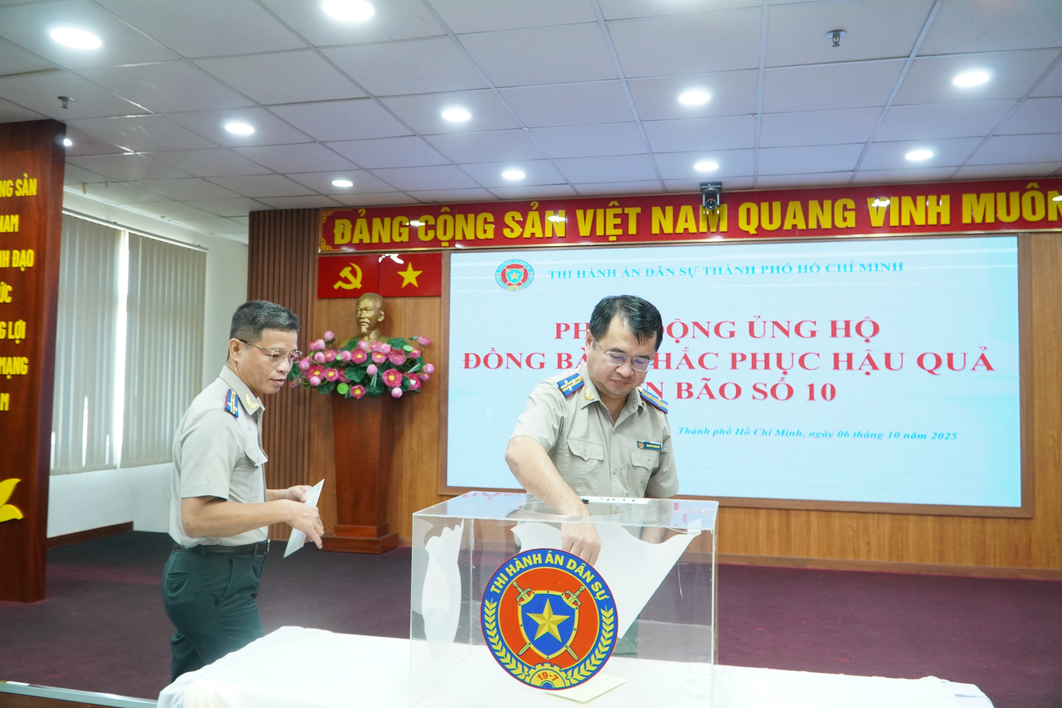 Sáng nay, ngày 06/10/2025, tại Thành phố Hồ Chí Minh (THADS Thành phố), THADS Thành phố đã tổ chức lễ phát động quyên góp ủng hộ đồng bào vùng bị thiệt hại do cơn bão số 10. Buổi lễ có sự tham dự của Ban Lãnh đạo Thi hành án dân sự Thành phố, lãnh đạo các phòng chuyên môn, các Phòng Thi hành án dân sự khu vực cùng toàn thể công chức, người lao động THADS Thành phố