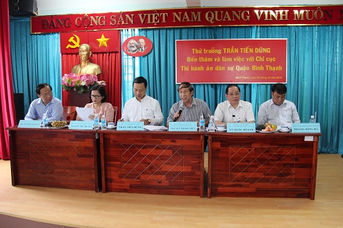 Chiều 21/10/2016, Thứ trưởng Bộ Tư pháp Trần Tiến Dũng, Phó tổng cục trưởng Tổng cục Thi hành án dân sự Nguyễn Thanh Thủy và Đoàn công tác Bộ Tư pháp đã có buổi làm việc với Chi cục Thi hành án dân sự (THADS) quận Bình Thạnh về công tác THADS năm 2016. Tham dự hội nghị còn có đồng chí Nguyễn Ngọc Minh – Phó trưởng Ban nội chính Thành ủy, đồng chí Nguyễn Văn Vũ - Phó giám đốc Sở Tư pháp thành phố, đồng chí Nguyễn Thị Thu Hà – Bí Thư Quận ủy quận Bình Thạnh, đồng chí Hoàng Song Hà – Chủ tịch Ủy ban nhân dân quận Bình Thạnh và đại diện các ban, ngành của quận Bình Thạnh.