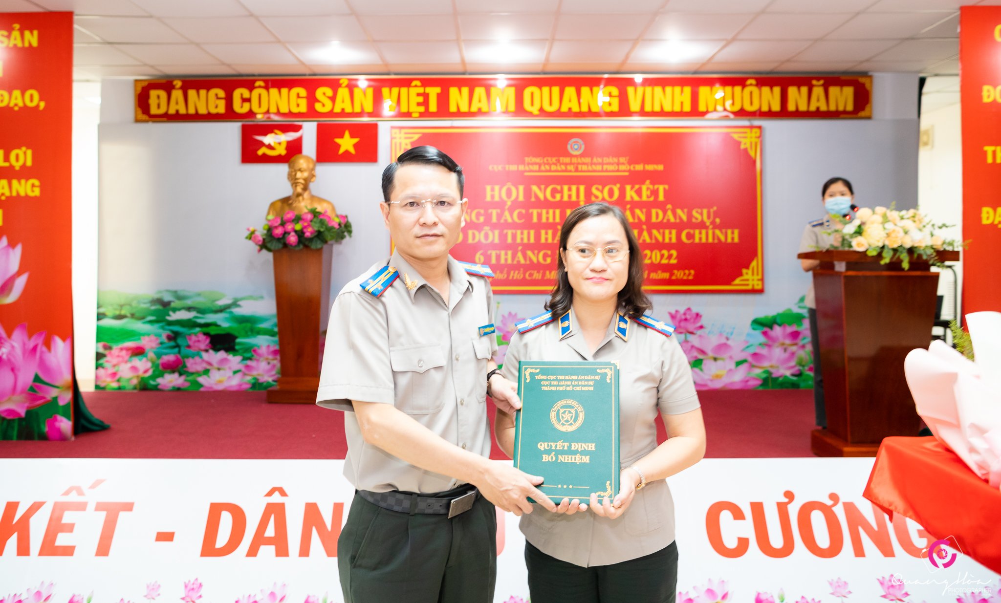 Cũng tại Hội nghị sơ kết, thừa uỷ quyền của lãnh đạo Tổng cục THADS, Quyền Cục trưởng Nguyễn Văn Hoà trao Quyết định bổ nhiệm Chi cục trưởng đối với bà Vũ Thị Ơn, Chấp hành viên Trung Cấp, phó Chi cục trưởng Chi cục THADS Quận 11, TP.HCM giữ chức vụ Chi cục trưởng Chi cục THADS Quận 11, TP.HCM theo Quyết định số 289/QĐ-TCTHADS ngày 28/4/2022 của Tổng cục THADS. Thời hạn giữ chức vụ là 05 năm kể từ ngày 01/5/2022.