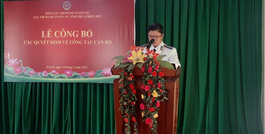Ngày 19/5/2022 Cục Thi hành án dân sự tỉnh Thừa Thiên Huế tổ chức công bố các Quyết định về công tác cán bộ của Chi cục Thi hành án dân sự huyện A Lưới