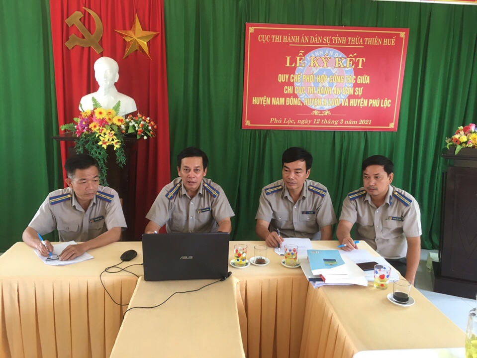 Thực hiện Quy chế phối hợp công tác, sáng 08/4/2021 Chi cục Thi hành án dân sự huyện Phú Lộc, Chi cục Thi hành án dân sự huyện Nam Đông và Chi cục Thi hành án dân sự huyện A Lưới phối hợp tổ chức họp trực tuyến để thảo luận, trao đổi một số vụ việc nhằm tháo gở khó khăn, vướng mắc trong quá trình tổ chức thi hành án.