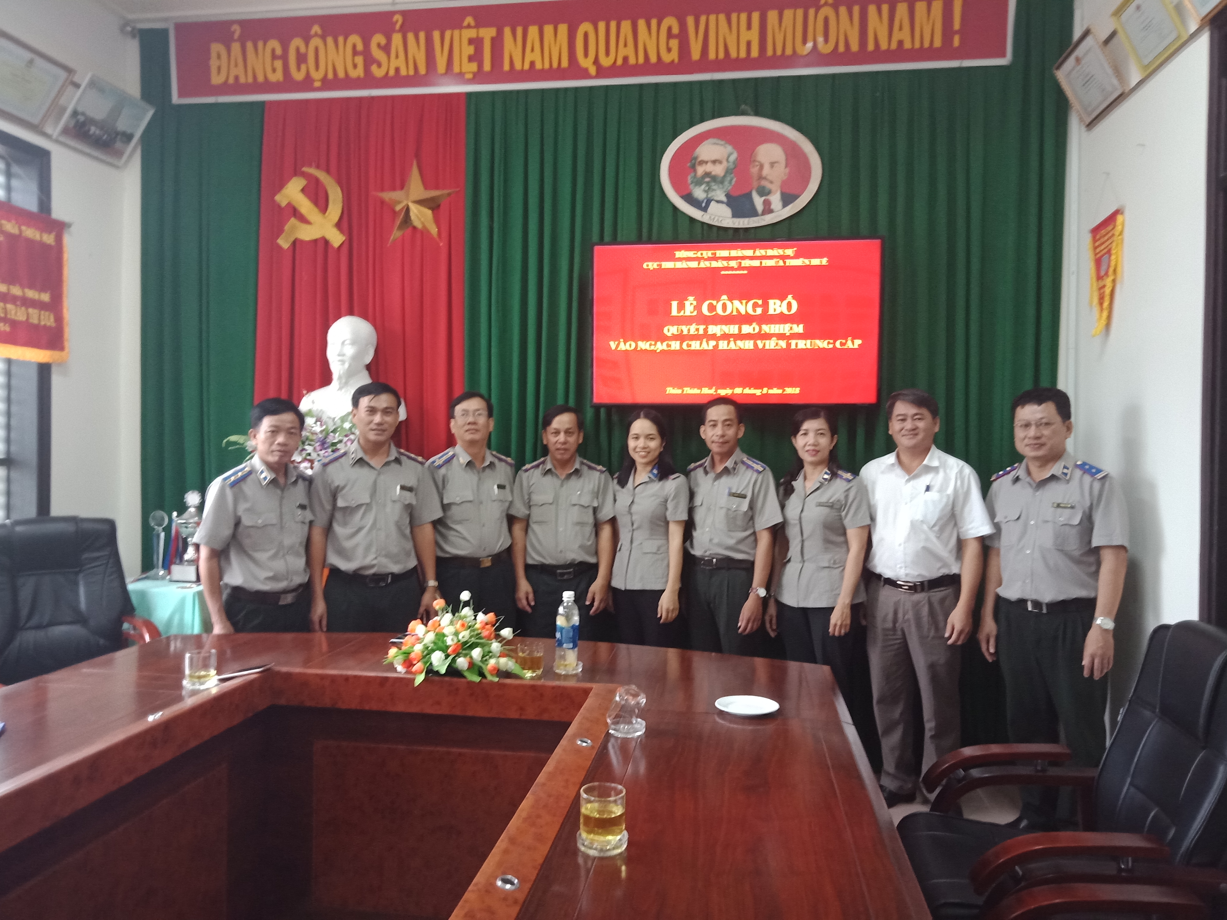Chiều ngày 08/8/2018, thừa ủy quyền của Lãnh đạo Bộ Tư pháp, Cục Thi hành án dân sự (THADS) tỉnh Thừa Thiên Huế tổ chức Lễ công bố và trao Quyết định của Bộ trưởng Bộ Tư pháp về việc bổ nhiệm Chấp hành viên trung cấp cho 02 công chức: ông Nguyễn Văn Long - Phó Trưởng phòng Phòng Nghiệp vụ và tổ chức thi hành án, ông Trương Quang Sĩ - Chi cục trưởng Chi cục THADS huyện Phú Lộc.