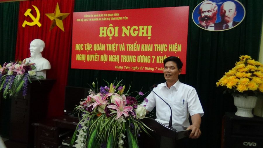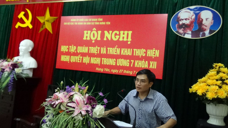 Tại Hội nghị, các cán bộ, công chức và người lao động của Cục Thi hành án dân sự tỉnh Hưng Yên được nghe đồng chí Vũ Hoàng Thụ - Bí thư chi bộ, Cục trưởng Cục THADS tỉnh và đồng chí Nguyễn Tuấn Khanh – Chi ủy viên, Phó cục trưởng Cục THADS tỉnh Hưng Yên giới thiệu khái quát về Hội nghị lần thứ bảy ban Chấp hành Trung ương Đảng khóa XII và 3 nghị quyết quan trọng được thông qua tại Hội nghị.