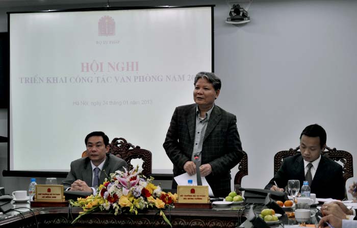 Chiều 24/1, Bộ Tư pháp đã tổ chức Hội nghị triển khai công tác văn phòng năm 2013. Tham dự Hội nghị có đại diện Ban Chỉ đạo Cải cách tư pháp Trung ương, Văn phòng Trung ương Đảng, Văn phòng Chính phủ, Bộ Công an, đại diện lãnh đạo các đơn vị thuộc Bộ và đại diện một số Sở Tư pháp và cơ quan Thi hành án địa phương. Bộ trưởng Hà Hùng Cường, Thứ trưởng Lê Hồng Sơn đã tới dự và phát biểu tại Hội nghị.Trong năm 2012, công tác văn phòng đã được triển khai đồng bộ trên các mặt công tác, ngày càng chuyên nghiệp, hiện đại, đóng góp đắc lực cho việc thực hiện các nhiệm vụ chính trị của Bộ, ngành. Trình độ công chức, viên chức, người lao động trong văn phòng ngày càng được tăng cường, nâng cao ý thực kỷ luật, kỷ cương công tác. Kết quả công tác văn phòng đã có nhiều chuyển biến mới.