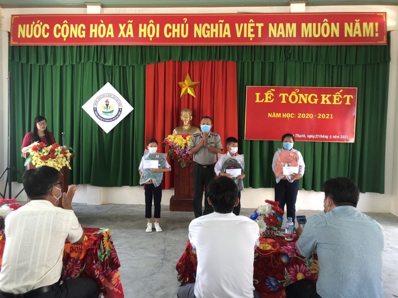 Thay mặt Chi cục Thi hành án dân sự huyện Vạn Ninh, đồng chí Võ Đức Quang đã phát biểu, biểu dương những thành tích xuất sắc trong năm học vừa qua, đồng thời động viên tinh thần vượt khó vươn lên trong học tập của các cháu học sinh Trường Tiểu học và Trung học cơ sở Vạn Thạnh. Đồng chí Võ Đức Quang gửi lời cảm ơn đến Ban Giám hiệu Trường Tiểu học và Trung học cơ sở Vạn Thạnh đã tạo điều kiện, hỗ trợ cho Chi cục Thi hành án dân sự huyện Vạn Ninh thực hiện chương trình “Ngành Tư pháp chung sức góp phần xây dựng nông thôn mới”. Đồng chí Võ Đức Quang đã trao các phần quà cho các cháu học sinh. Quà tặng hiện vật là Cặp sách và Tiền mặt, nguồn từ kinh phí hỗ trợ của cơ quan và vận động cán bộ, công chức và người lao động đóng góp với giá trị là 5.750.000đ (Năm triệu bảy trăm năm mươi nghìn đồng).