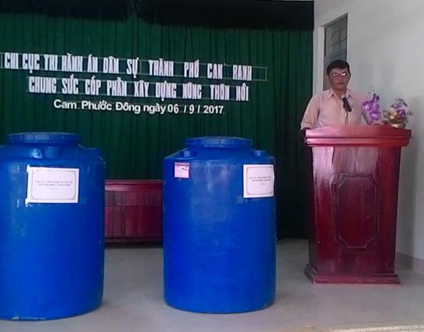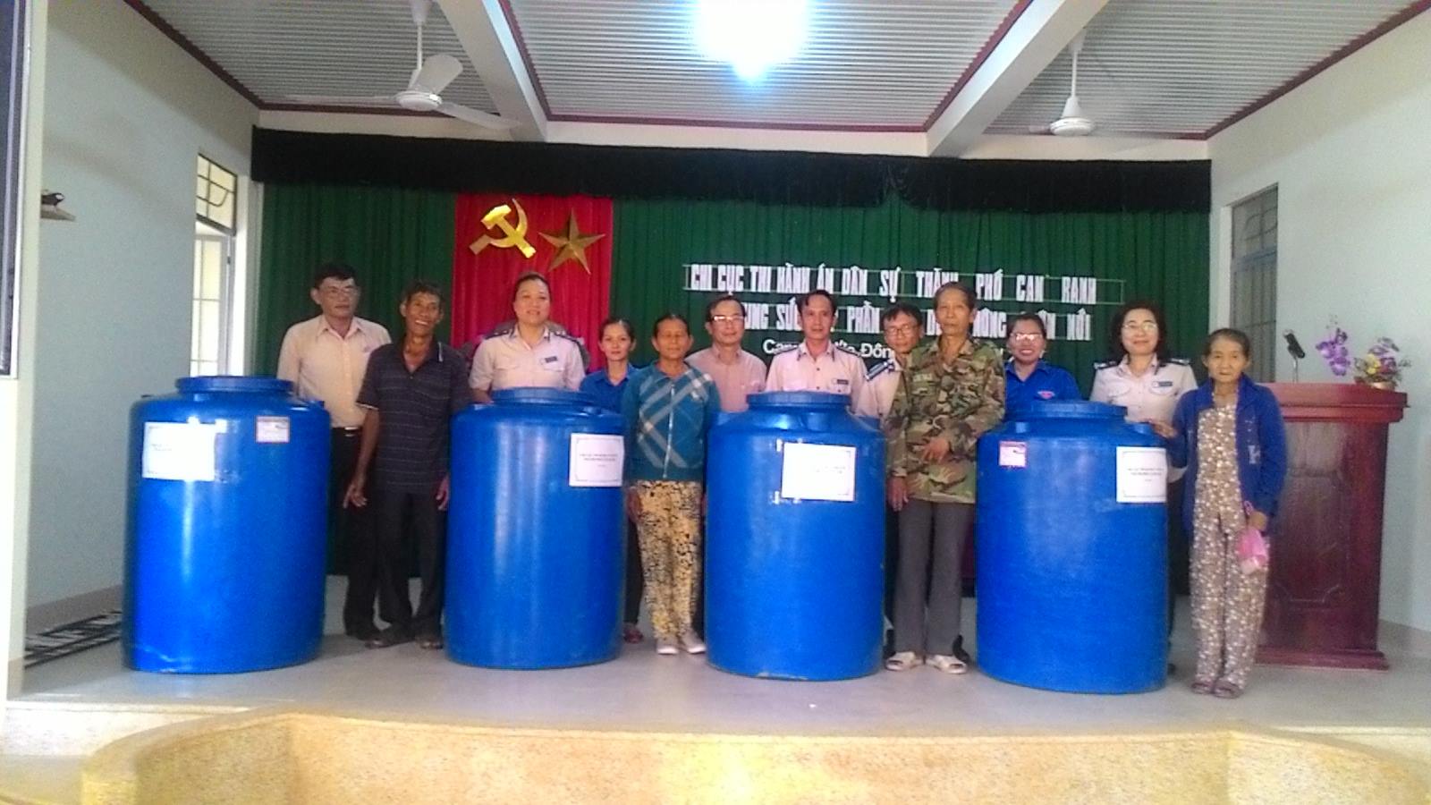 Đại diện Chi cục THADS thành phố Cam Ranh, Chi cục trưởng Nguyễn Thị Thùy Trang đã trao tặng 4 bồn chứa nước loại 500 lít cho 4 hộ gia đình nghèo trên địa bàn xã Cam Phước Đông. Đây là những gia đình nghèo, thường xuyên chịu ảnh hưởng do thiên tai lũ lụt, nguồn nước sinh hoạt bị nhiễm mặn nên gặp nhiều khó khăn trong cuộc sống.