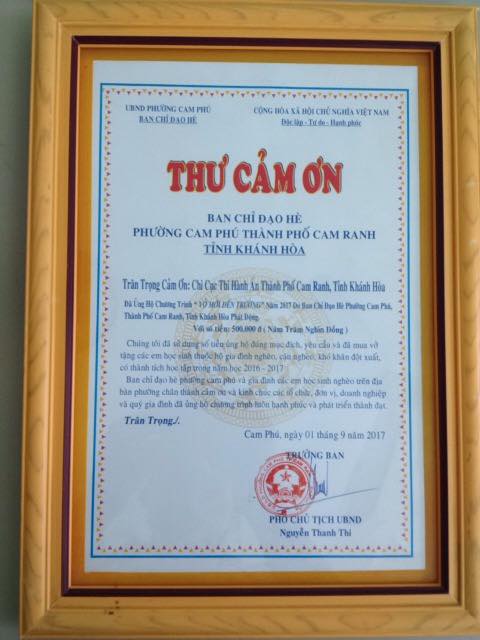 Trước đó, ngày 01/9/2017, Chi cục THADS thành phố Cam Ranh đã phối hợp với UBND phường Cam Phú, thành phố Cam Ranh thực hiện chương trình “vở mới đến trường” nhân dịp bước vào năm học mới. Tại chương trình Lãnh đạo Chi cục THADS thành phố Cam Ranh đã tặng quà cho 1 cháu học sinh có hoàn cảnh khó khăn mà cơ quan nhận đỡ đầu.