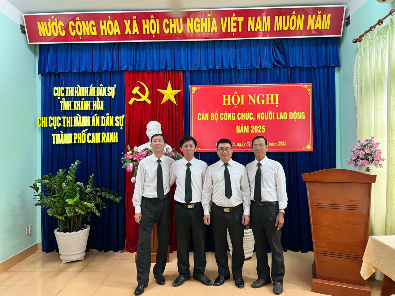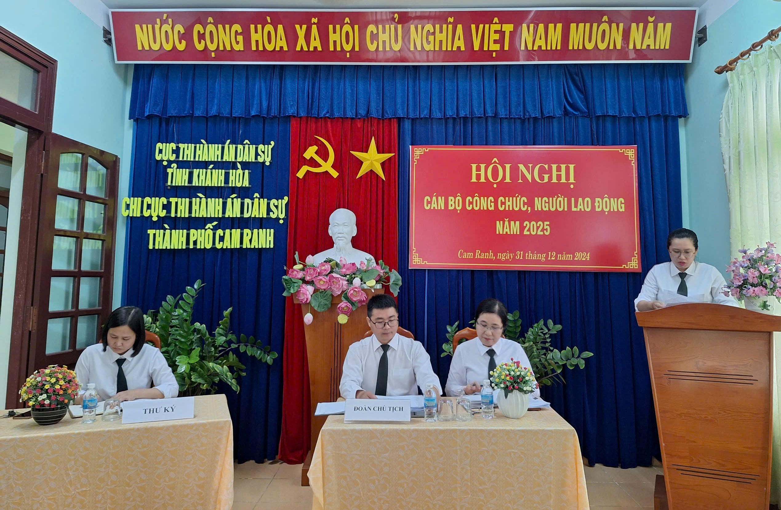 Thực hiện Hướng dẫn số 16/HD-LĐ ngày 09/12/2024 của Liên đoàn Lao động thành phố Cam Ranh, Chi cục Thi hành án dân sự thành phố Cam Ranh tổ chức Hội nghị cán bộ, công chức, người lao động (CBCC, NLĐ) năm 2025 nhằm kiểm điểm việc thực hiện Nghị quyết, chủ trương, đường lối của Đảng, pháp luật của Nhà nước có liên quan đến chức năng nhiệm vụ thi hành án; kiểm điểm việc thực hiện Nghị quyết hội nghị CBCC, NLĐ năm 2024 và những quy định về thực hiện dân chủ trong hoạt động của Chi cục Thi hành án dân sự. Qua đó, thảo luận, bàn biện pháp thực hiện kế hoạch công tác năm 2025.