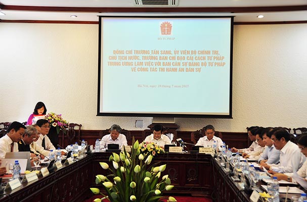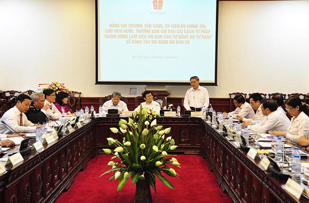Chiều 28/07/2015, tại Bộ Tư pháp, đồng chí Trương Tấn Sang, Ủy viên Bộ Chính trị, Chủ tịch nước, Trưởng ban Chỉ đạo Cải cách tư pháp (CCTP) Trung ương đã làm việc với Ban Cán sự Đảng Bộ Tư pháp về công tác Thi hành án dân sự.