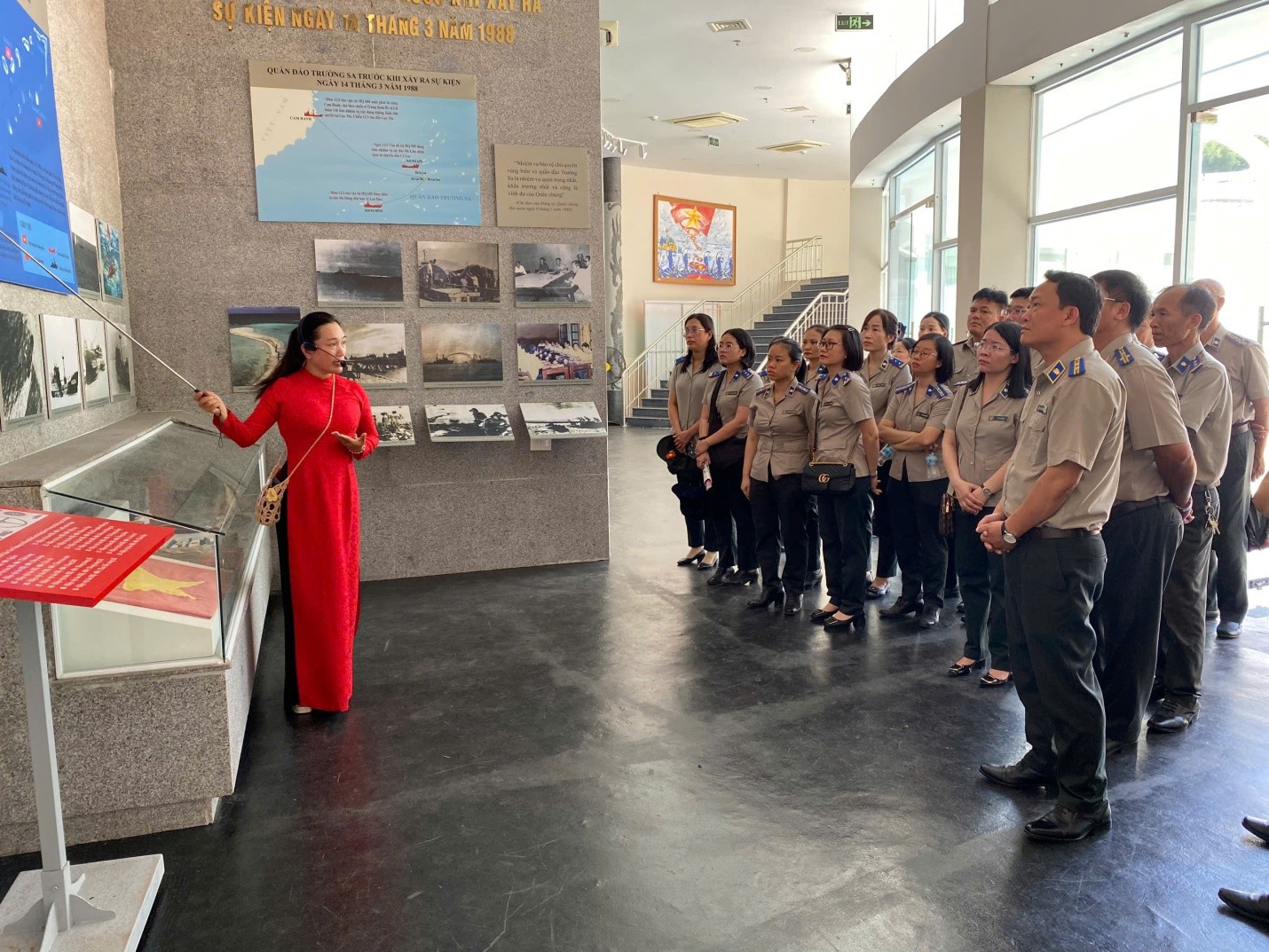 Tập thế đảng viên, công chức, người lao động của Cục đang lắng nghe hướng dẫn viên của khu tưởng niệm giới thiệu các kỷ vật của 64 chiến sĩ đã hy sinh ở đảo Gạc Ma tại khu trưng bày