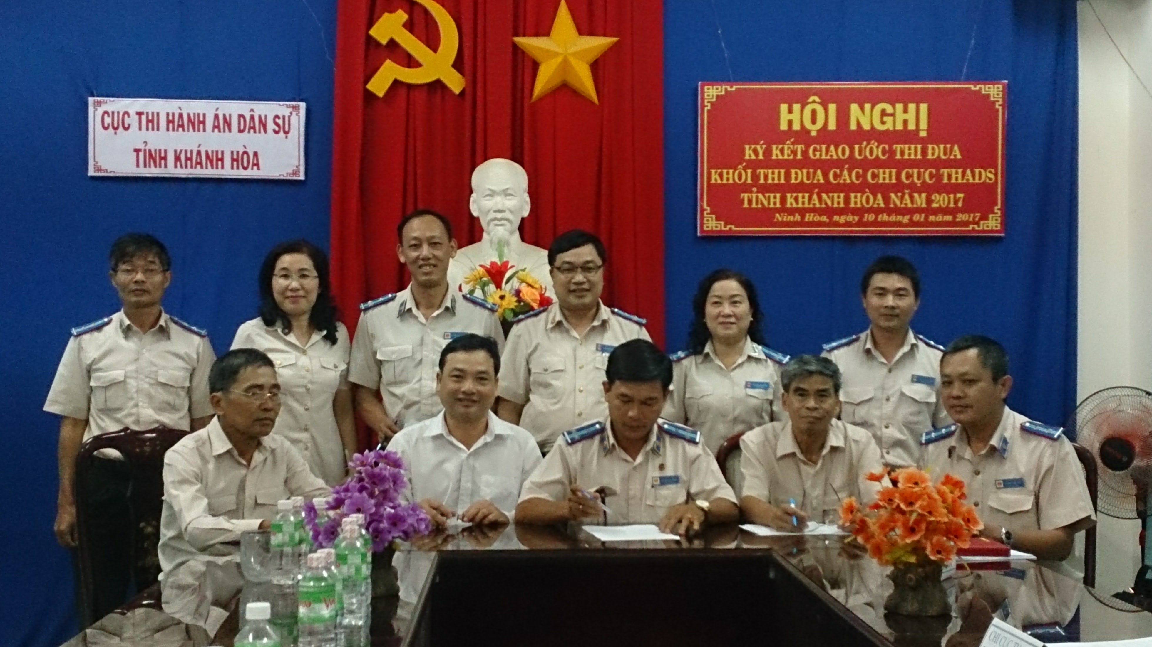 Tại Hội nghị ký kết, với vai trò là Trưởng khối thi đua Khối các Chi cục Thi hành án dân sự, đồng chí Nguyễn Quang Hòa – Chi cục trưởng Chi cục Thi hành án dân sự thị xã Ninh Hòa đã thông qua Bản đăng ký thi đua Khối các Chi cục Thi hành án dân sự. Bản đăng ký tập trung chủ yếu vào nội dung chỉ tiêu giao ước thi đua năm 2017, các đơn vị phấn đấu hoàn thành, hoàn thành xuất sắc các chỉ tiêu, nhiệm vụ chính trị được giao. Kết quả thực hiện các chỉ tiêu, nhiệm vụ cụ thể như: Ra quyết định đúng thời hạn đối với 100% bản án, quyết định về dân sự có hiệu lực pháp luật theo đúng quy định của pháp luật; Bảo đảm chính xác, đúng pháp luật trong việc xác minh, phân loại việc, tiền có điều kiện, chưa có điều kiện giải quyết; đăng tải kịp thời, đầy đủ danh sách người phải thi hành án chưa có điều kiện thi hành theo quy định của pháp luật; Giải quyết xong đạt tỷ lệ % về việc, về tiền (tiền và giá trị tài sản được quy ra tiền) trên tổng số việc, tiền có điều kiện thi hành và giảm số việc, tiền có điều kiện thi hành chuyển sang năm 2018 so với số chuyển kỳ sau của năm 2016 chuyển sang năm 2017 trên số có điều kiện; Tích cực xác minh, xác định điều kiện thi hành án, đảm bảo thi hành án phần dân sự trong các bản án hình sự có hiệu quả, nâng tỷ lệ thu hồi tiền, tài sản bị chiếm đoạt, tham nhũng đạt tỷ lệ trên 60%; Thi hành án xong các khoản thu cho ngân sách nhà nước tỷ lệ cao hơn năm 2016 về việc và tiền trên tổng số có điều kiện thi hành; bảo đảm theo dõi việc thi hành án đối với 100% bản án, quyết định của Tòa án về vụ việc hành chính có hiệu lực pháp luật; Khắc phục cơ bản vi phạm pháp luật trong hoạt động thi hành án dân sự; Các đơn vị trả lời bảo đảm chất lượng, đúng trình tự, thủ tục 87% số văn bản xin ý kiến chỉ đạo nghiệp vụ của Chấp hành viên trong đơn vị; Có kế hoạch, biện pháp tổ chức triển khai; phối hợp với các cơ quan, tổ chức liên quan đề xuất xây dựng, ban hành đầy đủ các văn bản hướng dẫn và chuẩn bị tốt các điều kiện để thi hành Luật sửa đổi, bổ sung một số điều của Luật thi hành án dân sự, các văn bản pháp luật về thi hành án dân sự, thi hành án hành chính; Giải quyết đơn, thư khiếu nại, tố cáo thuộc thẩm quyền đúng thời hạn, đúng trình tự, thủ tục theo quy định của pháp luật; thực hiện tốt công tác tiếp công dân; tích cực tham gia, phối hợp giải quyết xong cơ bản những vụ việc khiếu nại, tố cáo tồn đọng, kéo dài; Phối hợp với các cơ quan liên quan đề xuất bố trí , dự toán ngân sách hợp lý để đảm bảo điều kiện về cơ sở vật chất , phương tiện làm việc cho công chức, người lao động trong đơn vị; Tăng cường ứng dụng công nghệ thông tin, đẩy mạnh cải cách hành chính trong thi hành án dân sự.