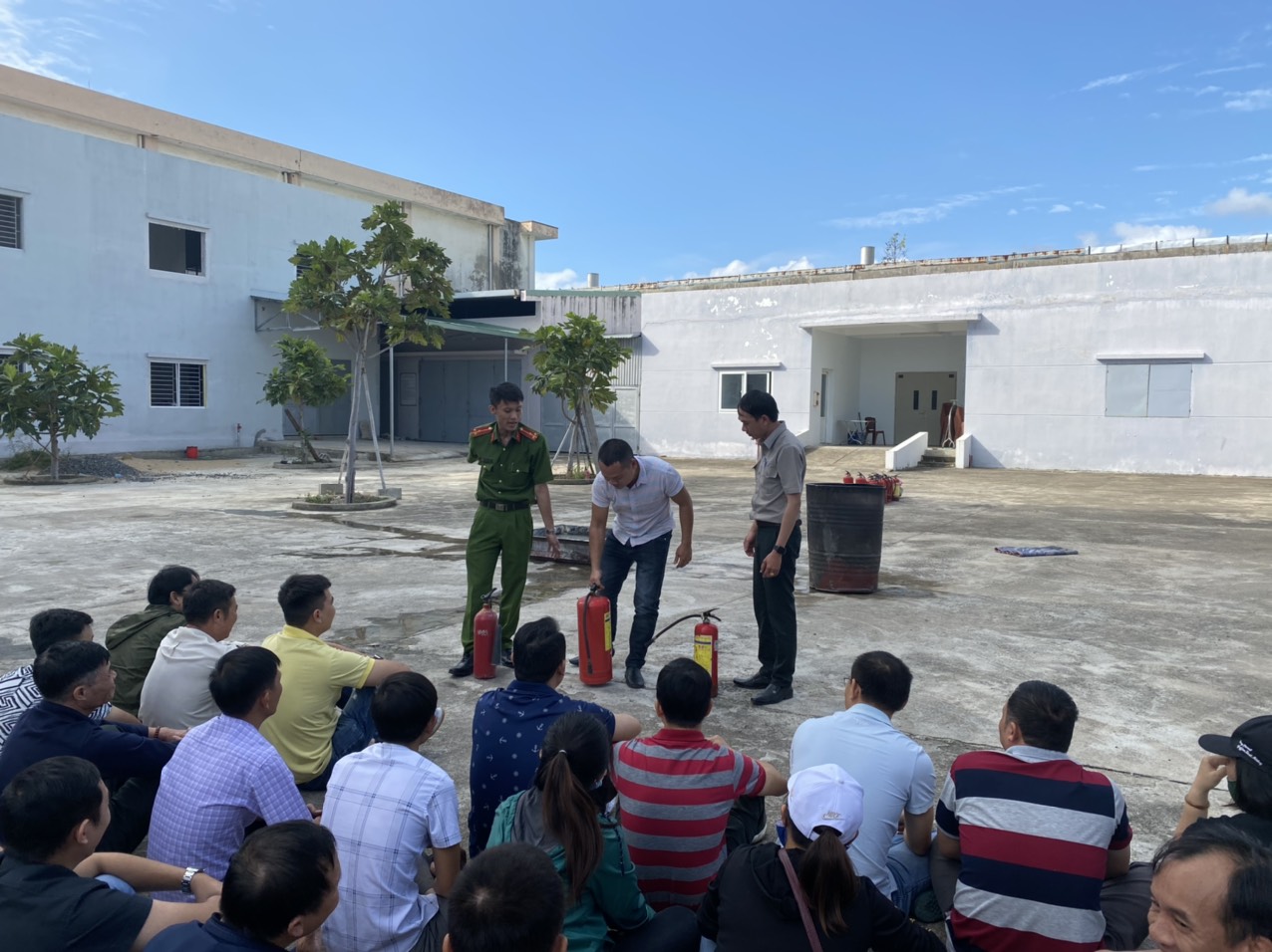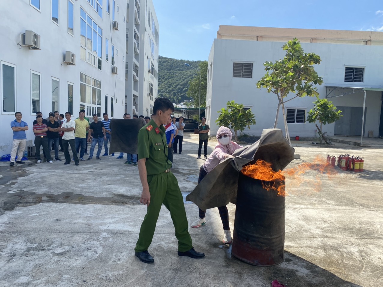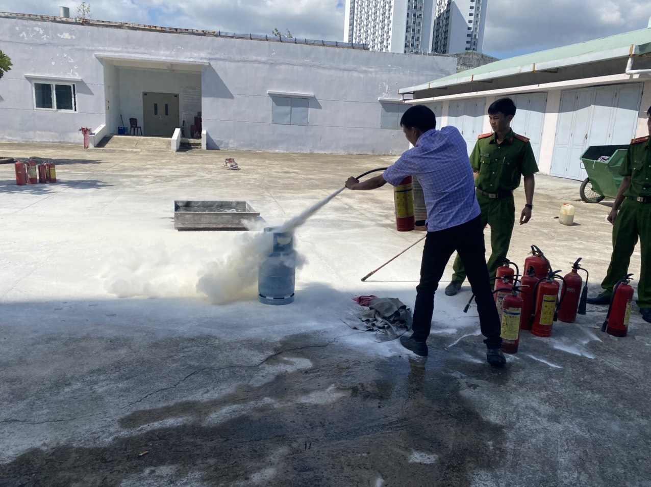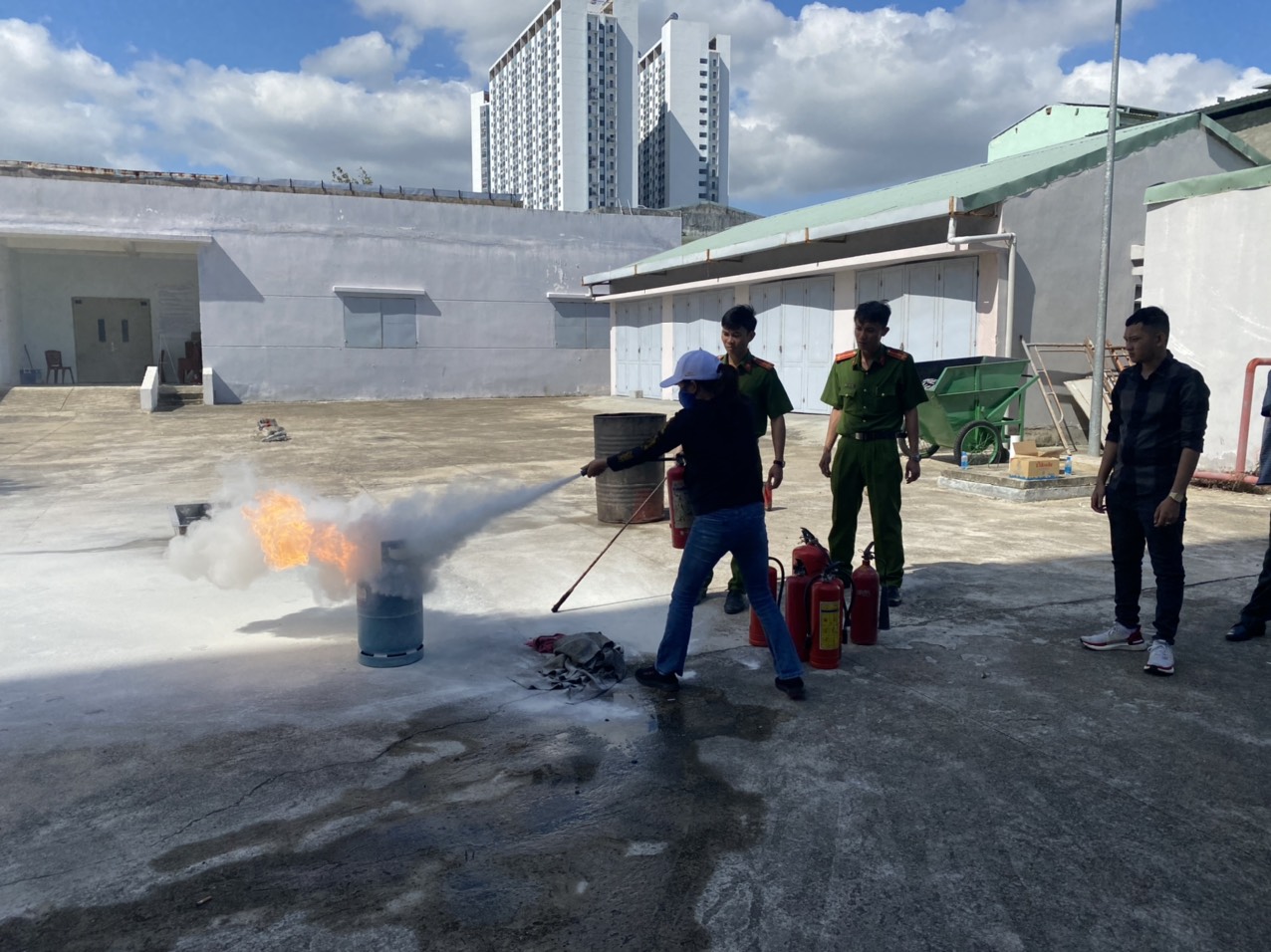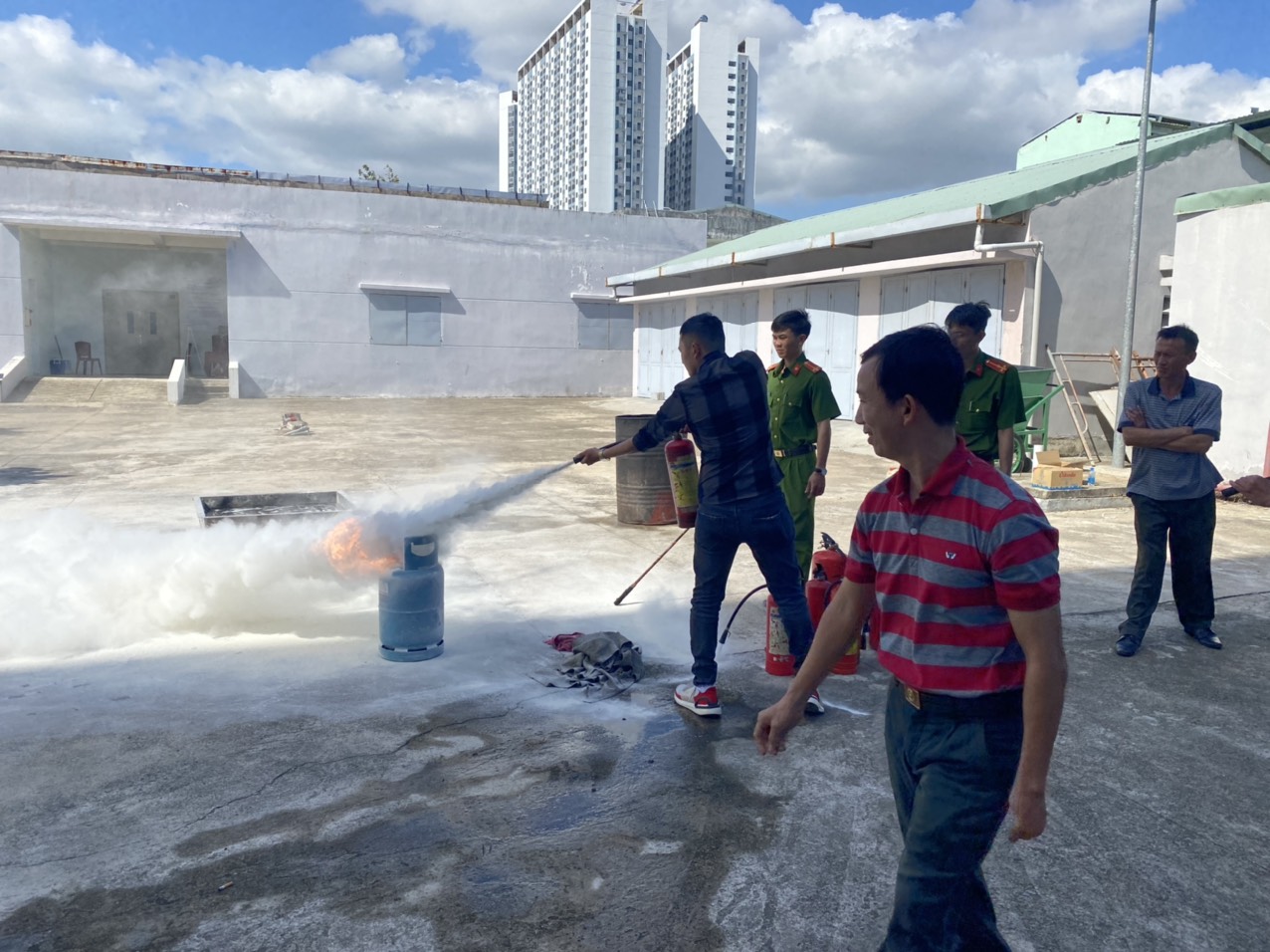 Thực hành tại thực địa, các đội PCCC của từng đơn vị đã được hướng dẫn sử dụng các phương tiện chữa cháy tại chỗ; Thực hành phương án xử lý tình huống cháy mẫu; Diễn tập phối hợp chữa cháy, thực hành sử dụng phương tiện chữa cháy để dập tắt đám cháy…