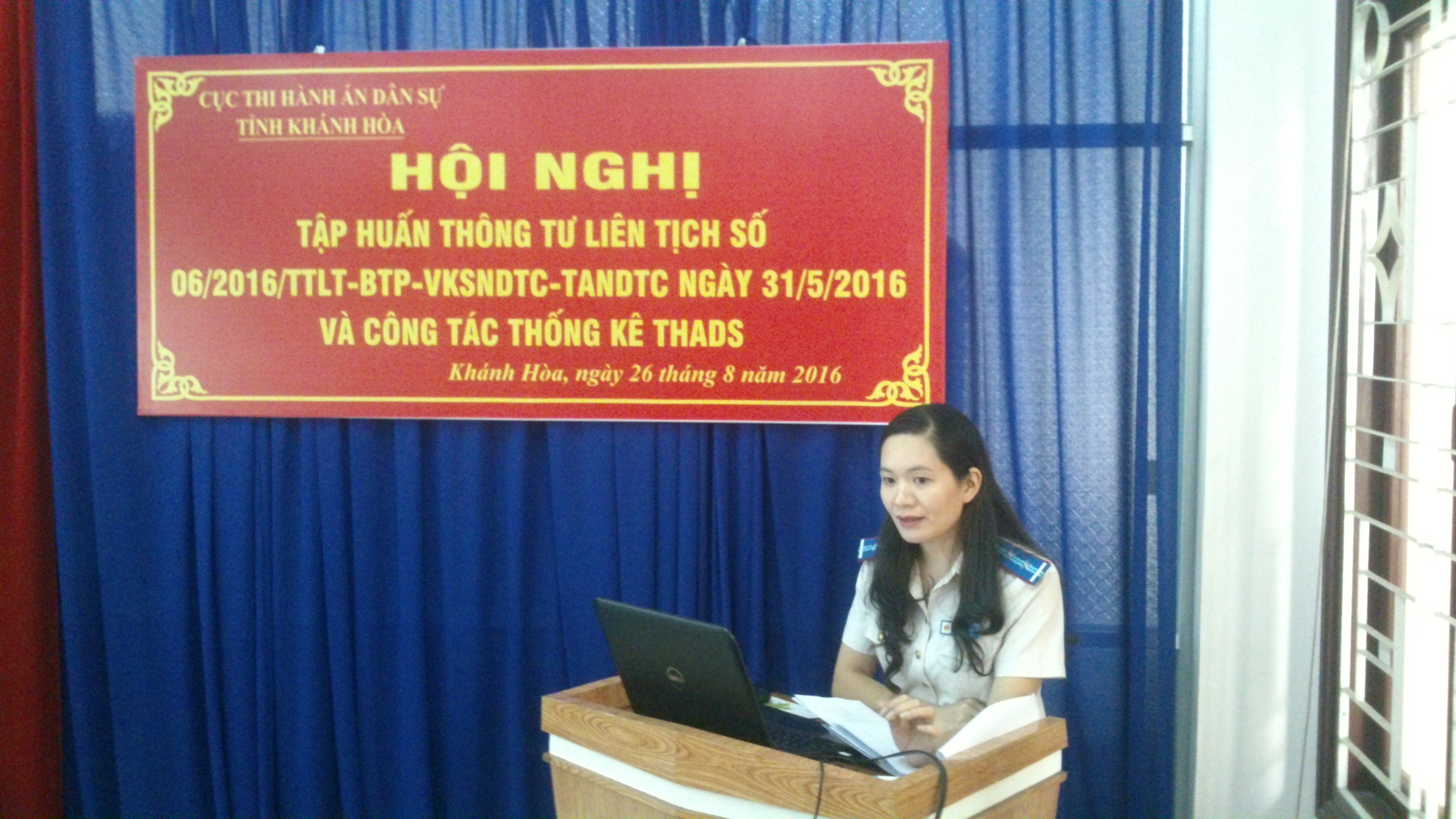 Để tổ chức thực hiện Thông tư liên tịch số 06/TTLT-BTP-VKSNDTC-TANDTC hướng dẫn phối hợp trong thống kê thi hành án dân sự và bảng tính thống kê theo tiêu chí mới, sau cuộc họp của lãnh đạo Cục Thi hành án dân sự, Viện Kiểm sát nhân dân tỉnh và Tòa án nhân dân tỉnh thống nhất biện pháp triển khai thực hiện Thông tư, ngày 26/8/2016 Cục Thi hành án dân sự tỉnh Khánh Hòa tổ chức Hội nghị tập huấn Thông tư liên tịch số 06/TTLT-BTP-VKSNDTC-TANDTC và công tác thống kê thi hành án dân sự.