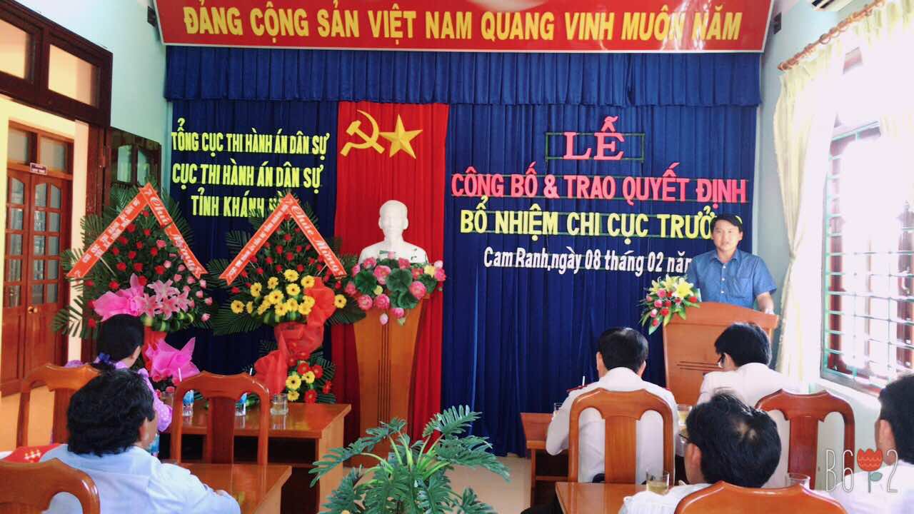 Trong hai ngày 08/02/2017 và 10/02/2017, Cục Thi hành án dân sự tỉnh Khánh Hòa đã tổ chức lễ trao Quyết định bổ nhiệm Chi cục trưởng Chi cục Thi hành án dân sự thành phố Cam Ranh và Chi cục trưởng Chi cục Thi hành án dân sự huyện Cam Lâm.